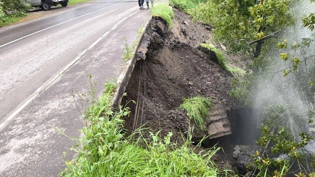 Еще одно разрушение заметили в районе дома №128 на улице Лесной. По словам властей, поток воды со склона разрушает грунт под дорогой. В итоге опасный участок перекрыли.