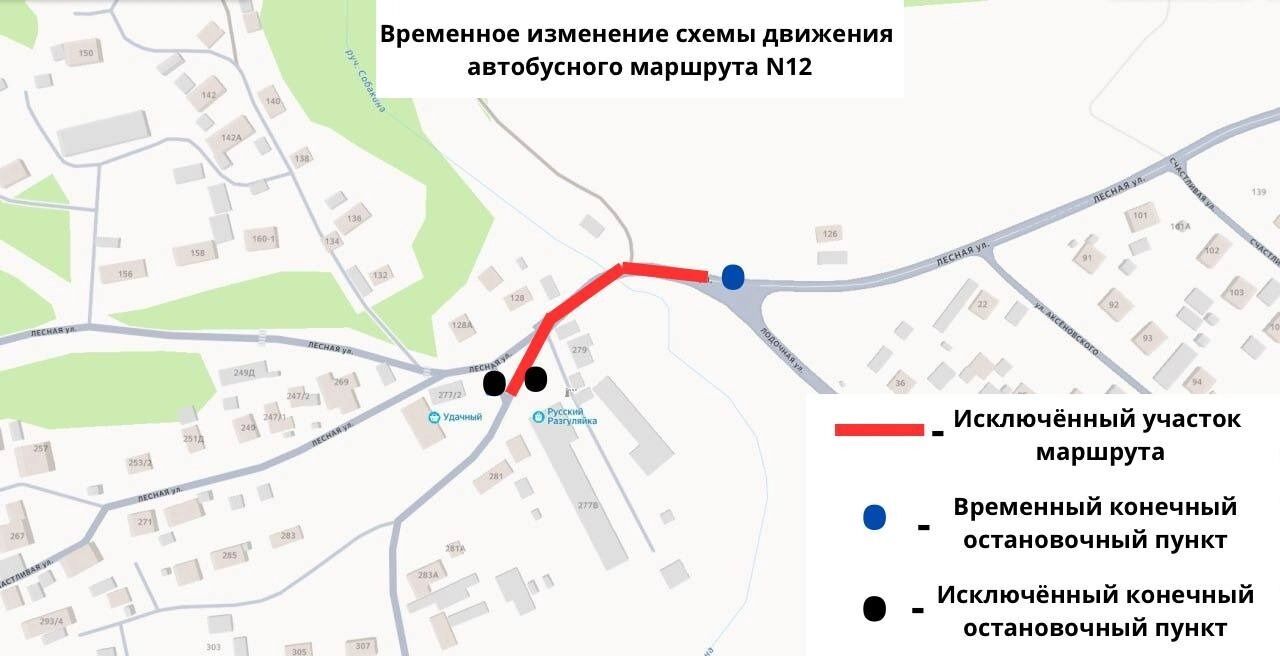 Из-за этого в мэрии решили перенести конечную остановку автобусного маршрута №12. Автобусы не будут доезжать до остановки «Совхоз Удачный» на Лесной, 277/2.
