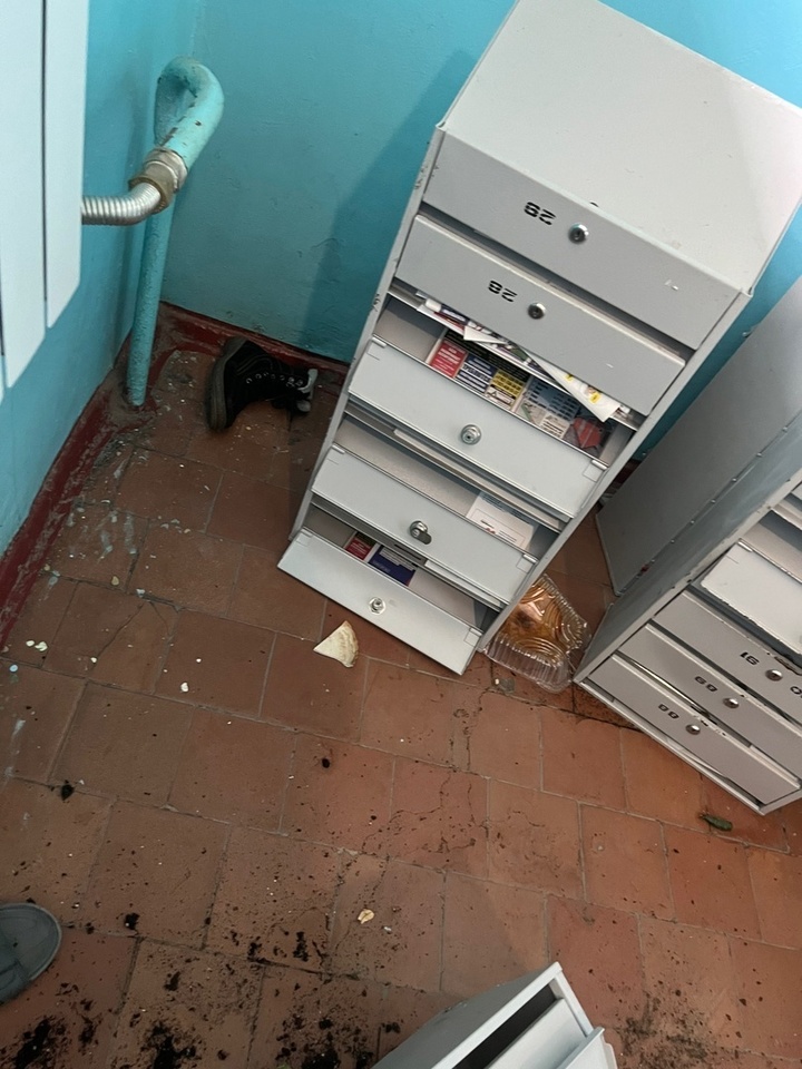 Местный житель поделился фото, на которых видно, что вандалы сломали почтовые ящики, один из них вынесли на улицу, разбили плитку на полу, уронили горшок с цветком, разбросали обувь, перевернули урну у входа в подъезд, а также оставили мусор.