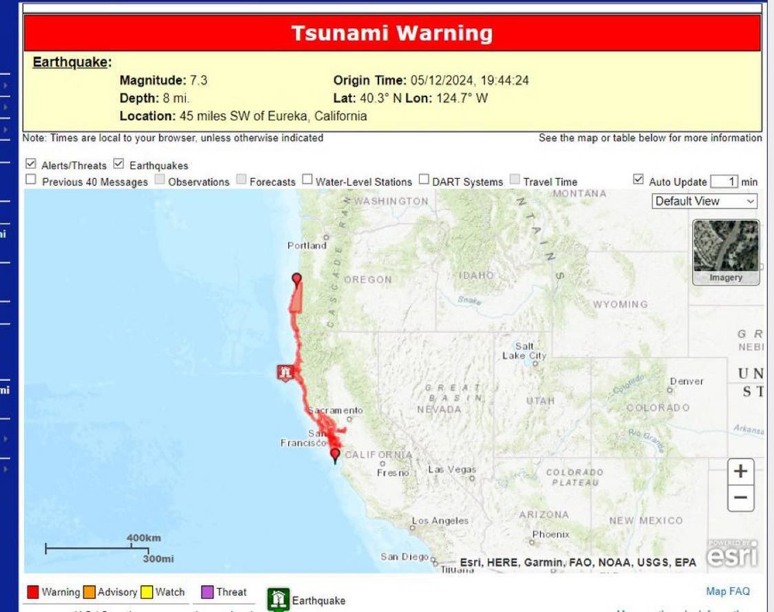 Для участков побережья в штатах Калифорния и Орегон объявлено предупреждение о цунами.