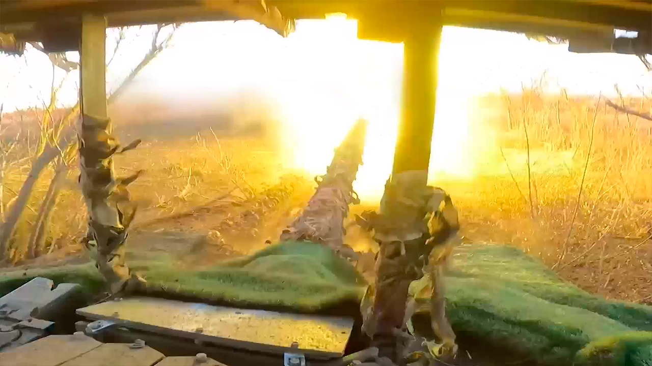 Огонь корректировался с помощью беспилотников, их же камеры фиксировали попадания. Отработав по цели, экипаж покинул позицию. Танки замаскированы, а также защищены на случай атаки беспилотниками, установлены антидроновые навесы.