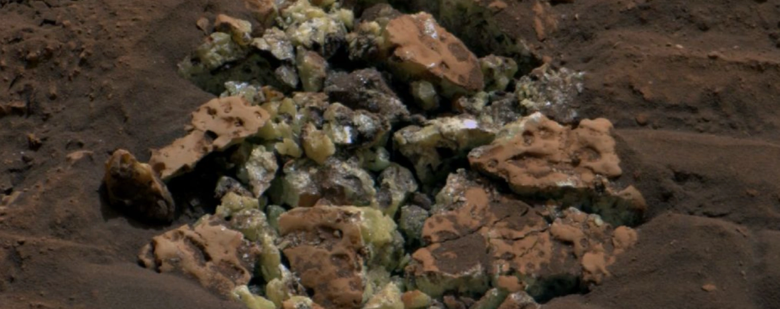 Во время работы марсоход Curiosity своим 899-килограммовым корпусом наехал на камень, из-за чего тот треснул, обнажив внутри желтые кристаллы элементарной серы. Хотя сульфаты давно известны как довольно распространенные минералы на Марсе, чистая сера в элементарной форме здесь обнаружена впервые.
