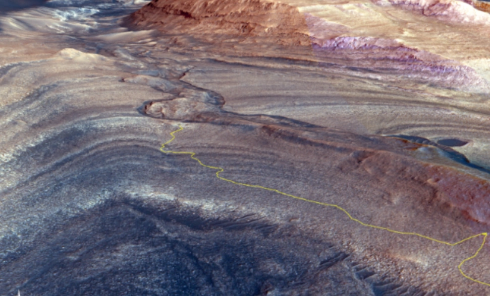Путь Curiosity (отмеченный на карте желтым) пролегал к каналу Гедиз Валлис, древнему руслу, где когда-то текла река. Скалы этого района до сих пор несут следы действия воды, исчезнувшей миллиарды лет назад.