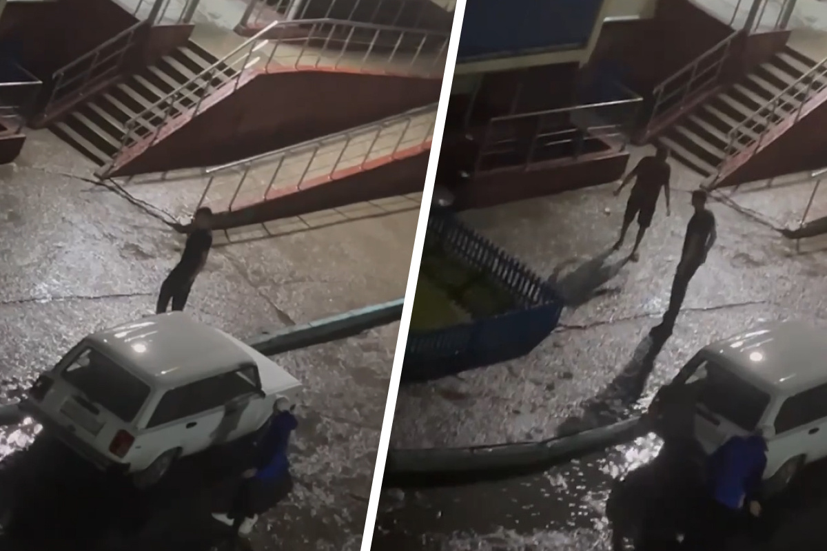 Судя по кадрам, мужчина сначала гонялся по двору за одним молодым человеком, но, не сумев его догнать, начал задирать второго парня. Сибиряк несколько раз ударил юношу по лицу. Чем закончился конфликт, остается неизвестным.