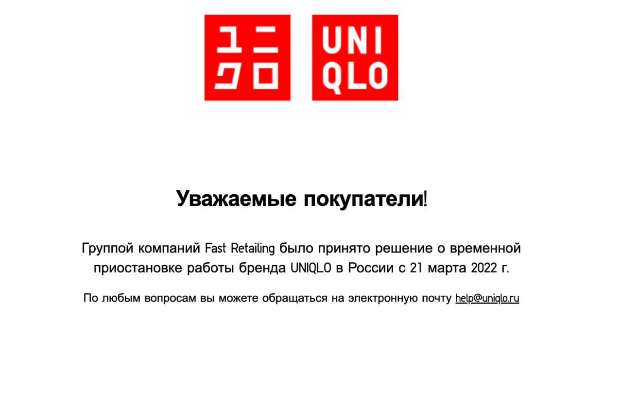 В марте 2022 года компания Fast Retailing Co., которая управляет сетью магазинов Uniqlo, заявила о приостановке деятельности в России.