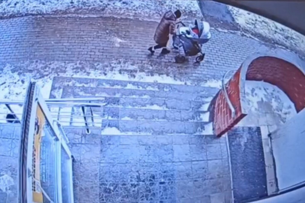 На кадрах видна мама, гуляющая с ребенком. Она проходит мимо подъезда, и буквально в нескольких сантиметрах от неё падает и разбивается кирпич.
