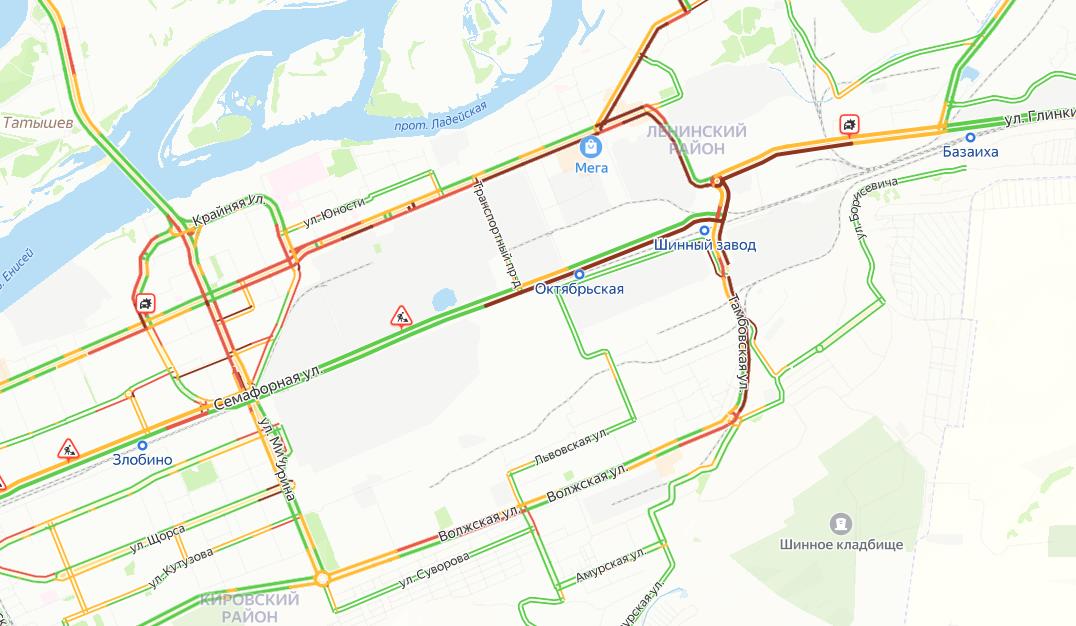Авария с участием грузовиков произошла в направлении выезда из города. Дорожный затор образовался на Семафорной, Тамбовской, 26 Бакинских комиссаров, проспекте имени газеты «Красноярский рабочий».