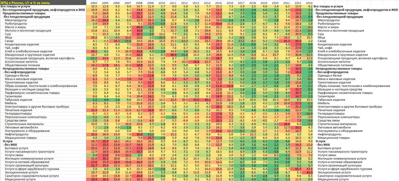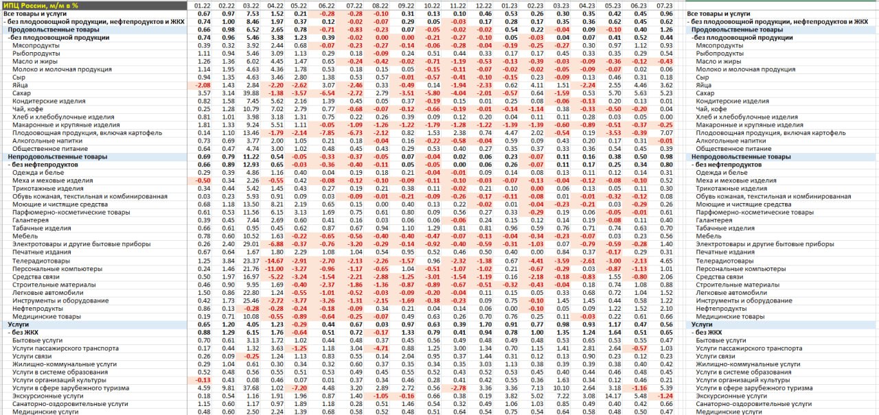 С начала 2023 по июль 2023 инфляция в России выросла на 3.41%, из которых продовольственные товары обеспечили 0.38 п.п плюс плодоовощная продукция 0.65 п.п, непродовольственные товары внесли 0.74 п.п, а услуги сформировали 1.66 п.п или почти половину в структуре общей инфляции с начала года.