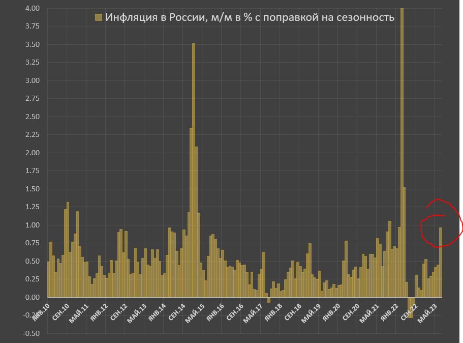 Центробанк фиксирует в июле самый существенный с апреля 2022 инфляционный всплеск в России – 1% м/м рост инфляции с поправкой на сезонность.