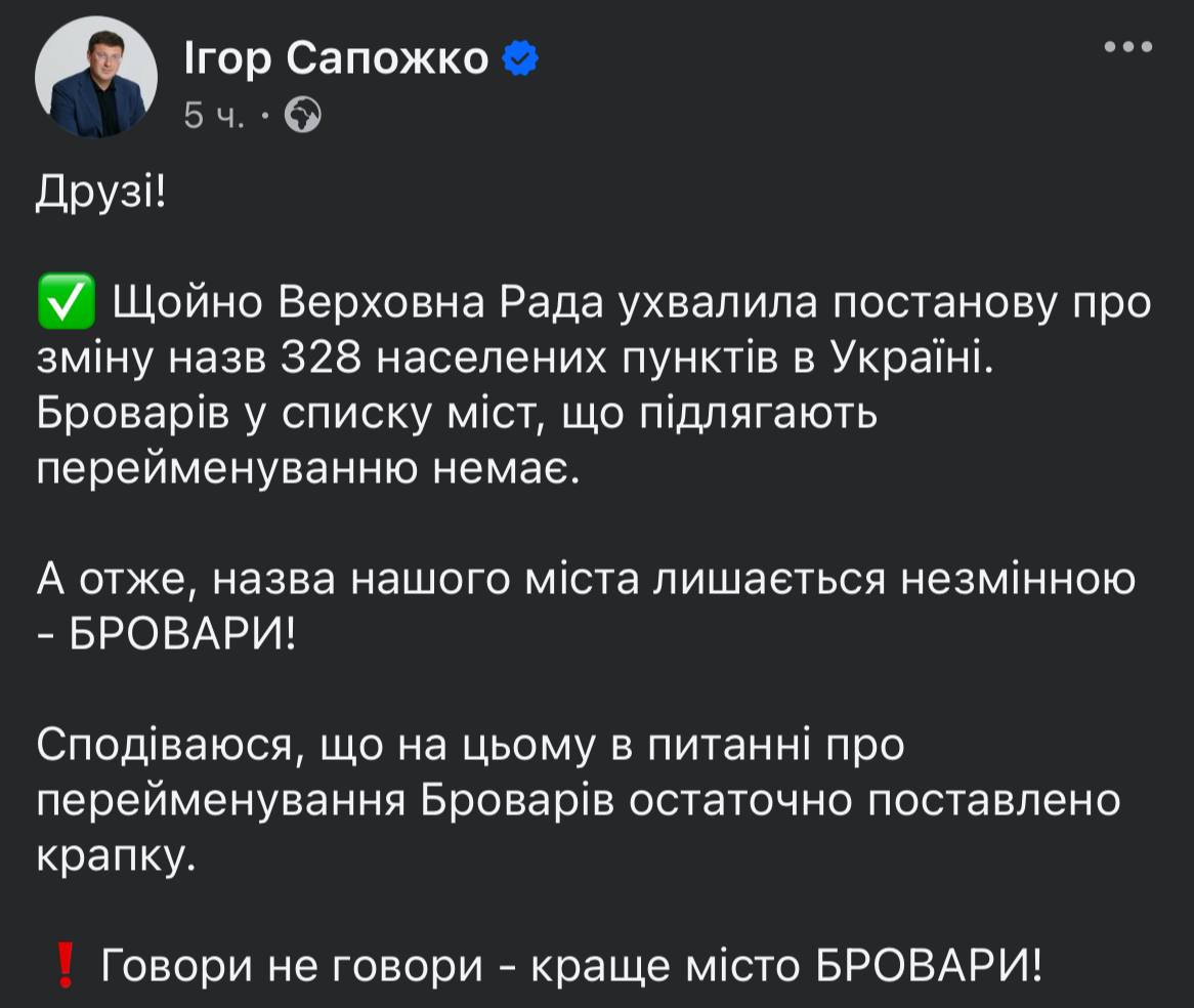 ℹ️ Сегодня ВР утвердила постановление о переименовании 328 населенных пунктов — города Бровары Киевской области в нём нет.