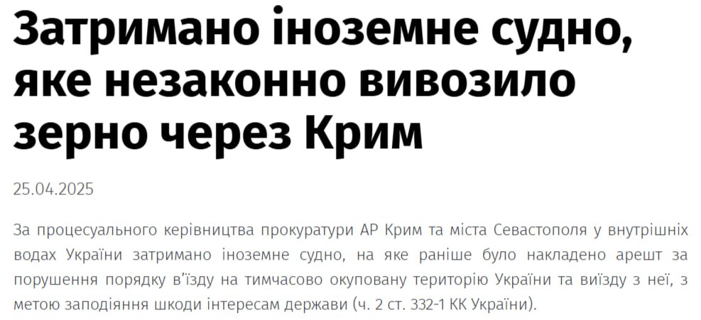 Указывается, что в ноябре 2024 сухогруз под флагом иностранной страны вывез из Севастопольского морского торгового порта более 4,6 тыс тонн пшеницы, вероятно полученной с территорий Запорожской и Херсонской областей.