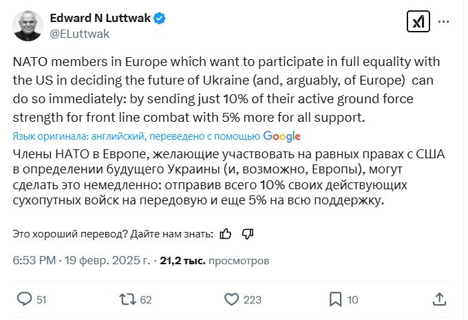 В этом и ещё нескольких твитах бывший советник Рейгана по нацбезопасности, военный историк и член высшей экспертократии США Эдвард Люттвак объясняет нынешнюю позицию Америки по отношению к украинской проблеме. Европа это «безбилетник» в украинском конфликте, и если она не согласна с американской позицией, пусть каждая европейская страна пошлёт 10% своей армии на Украину.