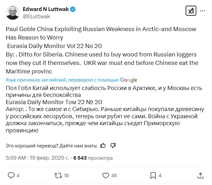 А во втором твите Люттвак говорит то, что наверняка трамписты сейчас говорят Кремлю: вам (т.е. россиянам) пора уходить от Китая. Думаю, это одно из условий трампистов, возможно, даже ценой сдачи Украины в сторону России.