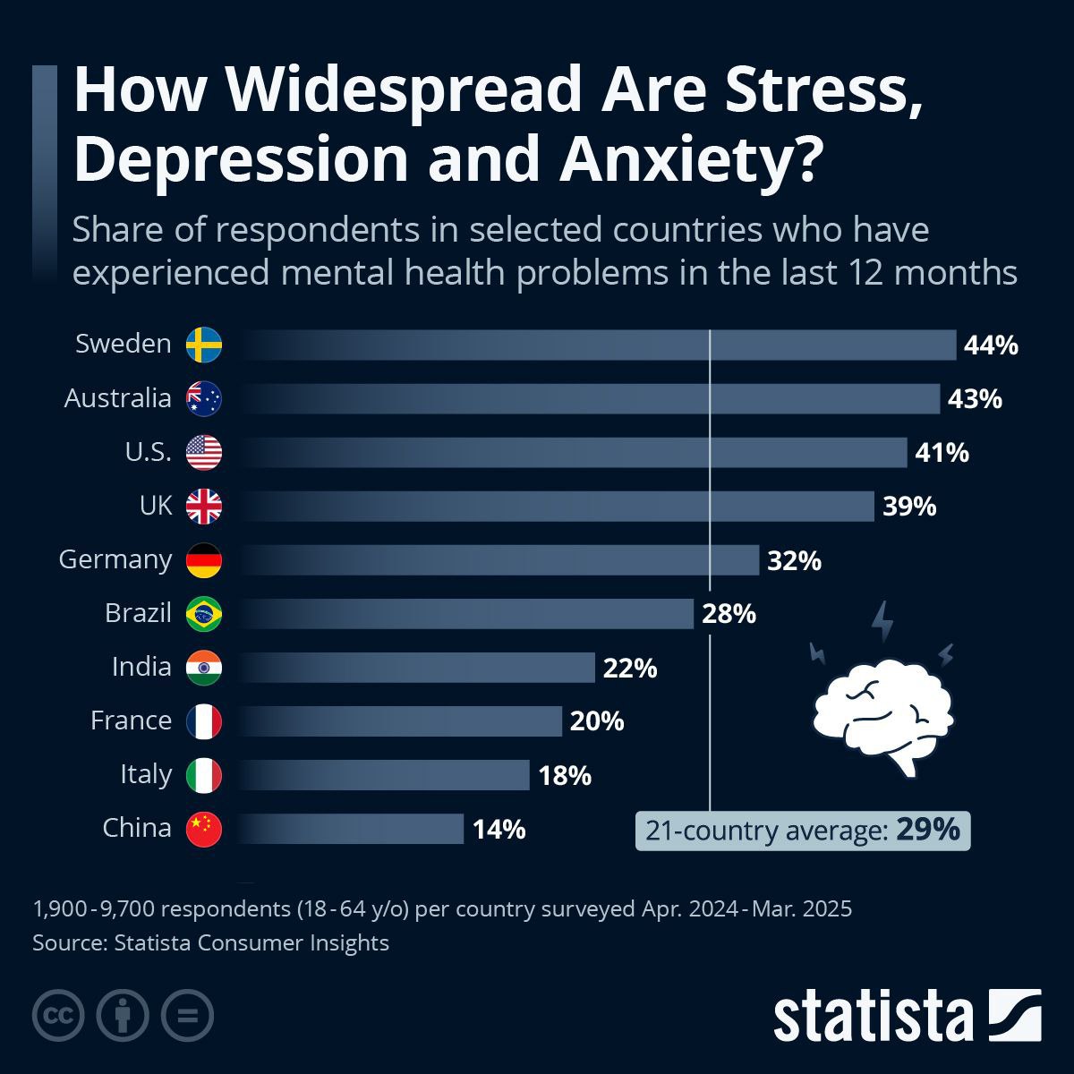 Жители Швеции, Австралии и США больше всего жалуются на проблемы с психическим здоровьем. На диаграмме — доля респондентов, заявивших, что у них за последний год возникли ментальные проблемы.