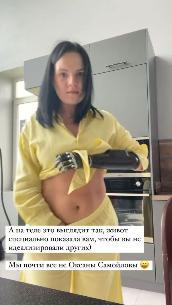 Многодетная мама, потерявшая кисти рук из-за ревнивого первого мужа, с юмором относится к собственной внешности и не стесняется предстать перед подписчиками в невыгодном свете. На этот раз она вышла к поклонникам в свободном костюме лимонного цвета и оголила живот.