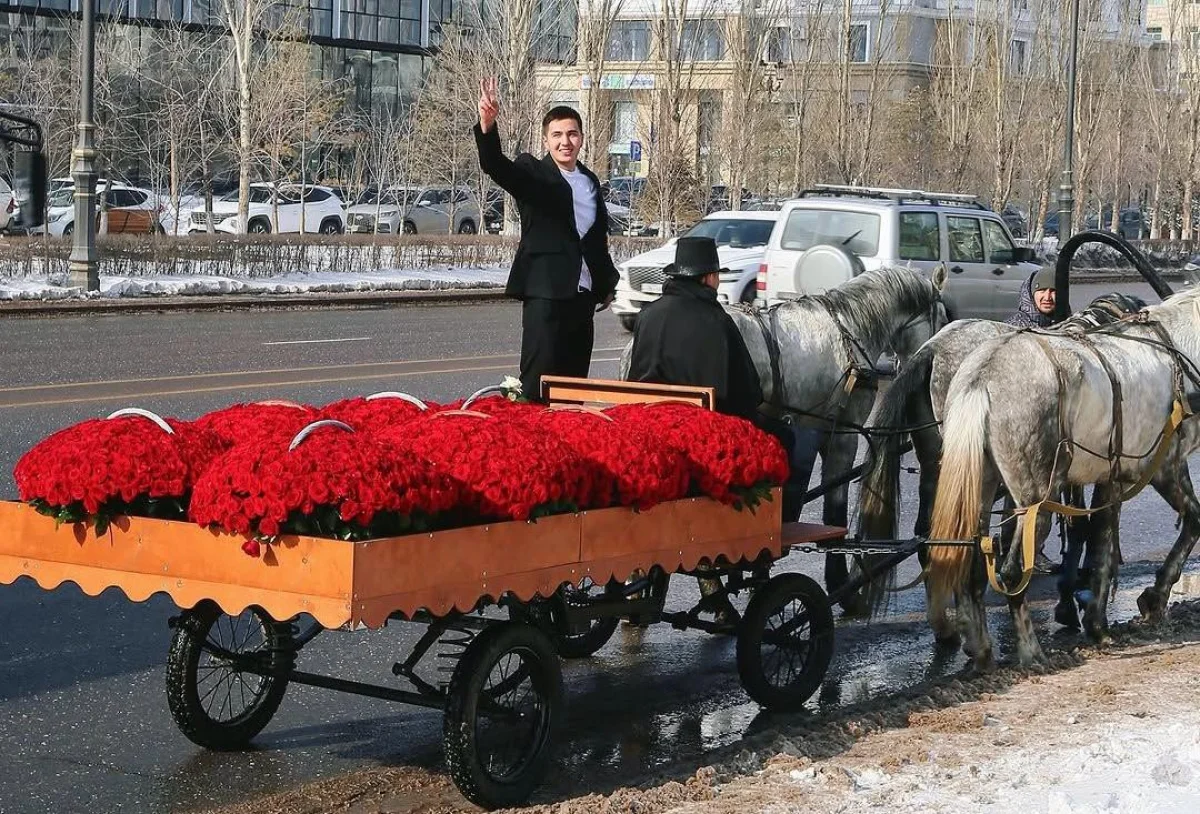 Жители Астаны стали свидетелями романтичного жеста — блогер проехался с каретой по улице Мангилик Ел, а затем, остановившись, сделал предложение своей супруге.