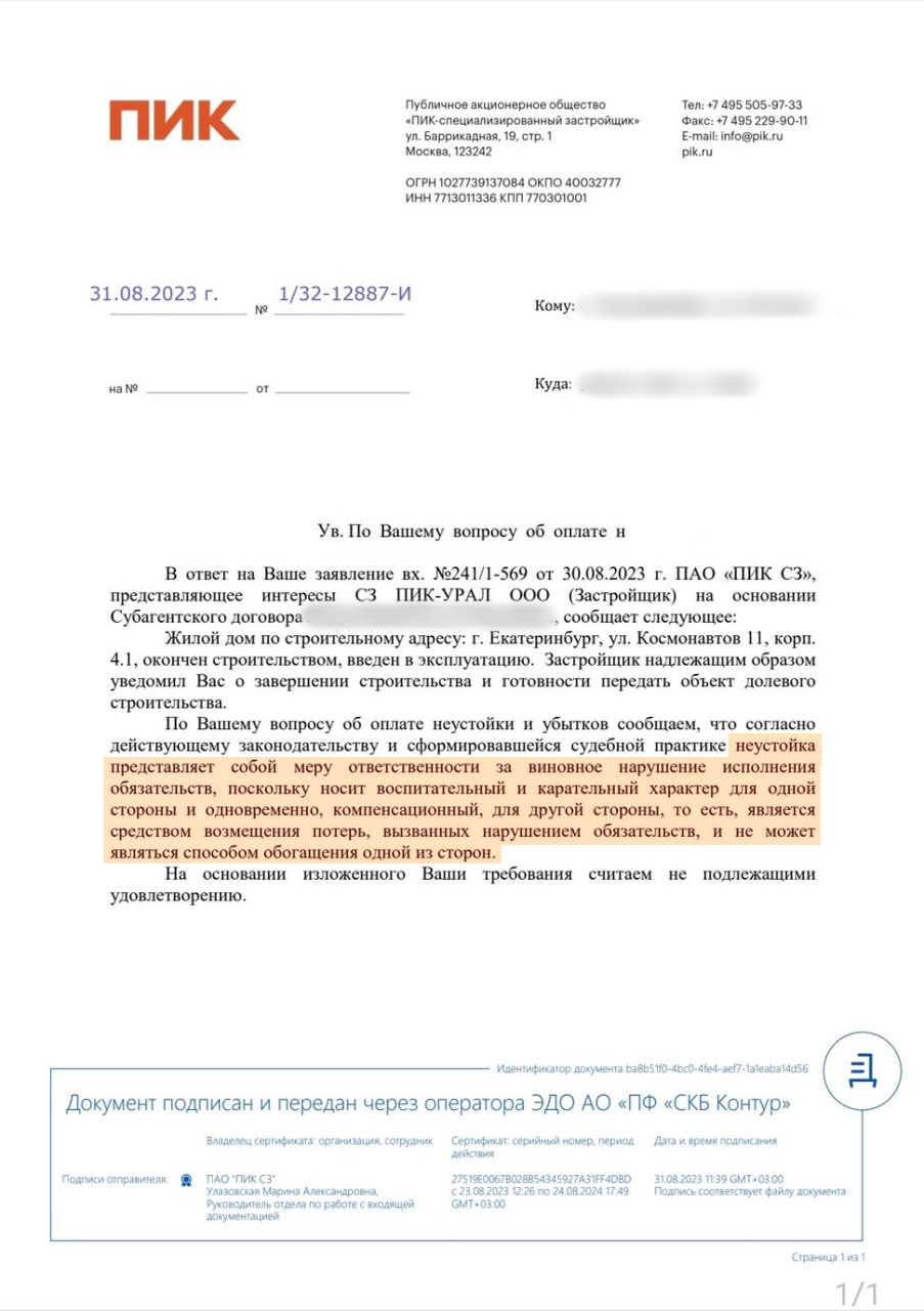 — Сталкивались с этим, сейчас ведем такие дела в суде. Они неправомерно отказывают в выплате, действие постановления, приостанавливающего взыскание неустойки, окончено. ПИК делает это с целью сэкономить, так как далеко не все собственники будут обращаться в суд, — считает Иван Похвалитов из компании Pro Bono Ural.