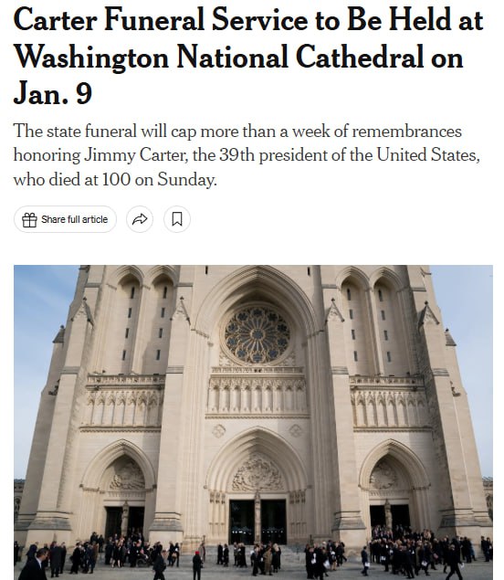 9 января в Национальном соборе Вашингтона пройдет панихида, на которой выступит президент Джо Байден. Похоронят Джимми Картера в его родном городе Плейнс, штат Джорджия.