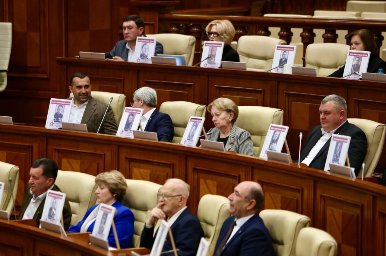 Оппозиционные депутаты выразили свой протест: они пришли на заседание парламента страны с портретами ветеранов Великой Отечественной войны.