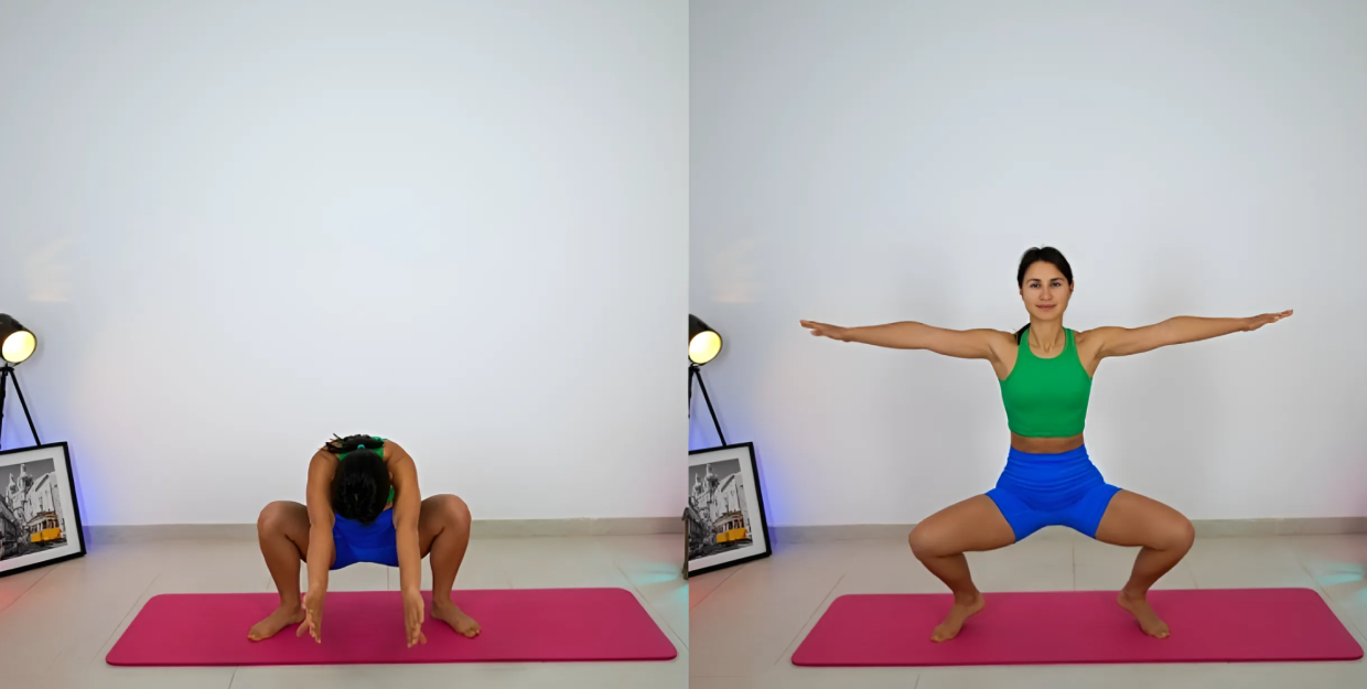 - Примите положение глубокого приседа с широкой постановкой ног, стопы прижаты к полу.