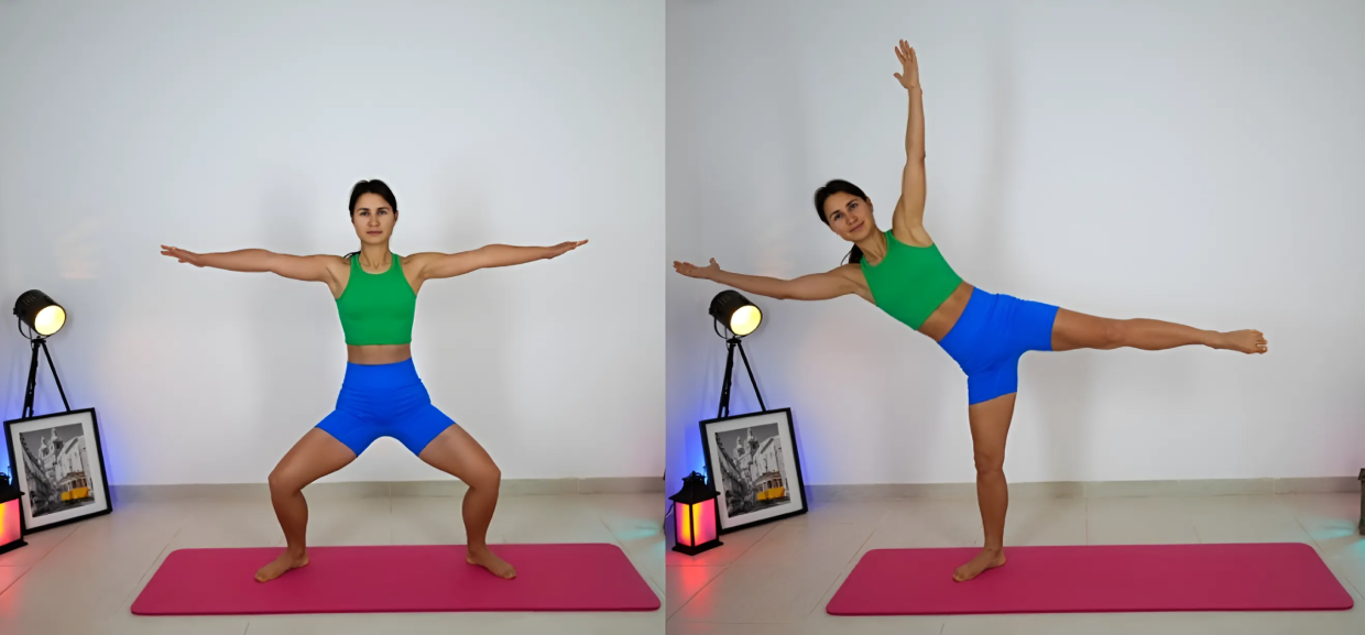 - С выдохом оттолкнитесь и перенесите вес тела на одну ногу, при этом корпус наклоните в сторону опорной ноги. Руки переведите вверх, вытягивайтесь от макушки до кончиков пальцев свободной ноги.