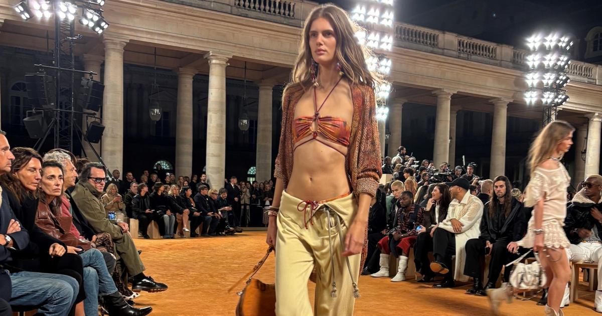 Passer la publicité Passer la publicitéUne fois n’est pas coutume, nous avons assisté au show Isabel Marant, jeudi soir, au beau milieu du Palais-Royal, avec une novice. Perrine Laffont n’est ni influenceuse ni journaliste, mais championne olympique de ski de bosses. « J’ai déjà assisté à un défilé Moncler à Saint-Moritz, mais c’est mon premier défilé de la Fashion Week », nous confie-t-elle avec un grand sourire. Elle contrôle à peine son excitation en s’asseyant au premier rang à quelques encablures de Paris Hilton, Lou Doillon et Héléna de la « Star Academy ». « Tout le monde connaît Isabel Marant ! » Mais finalement ce n’est pas la plus connue des Parisiennes qui sort saluer à la fin du show, mais Kim Bekker, avec qui elle cocréait les collections depuis 2021 et à qui elle a passé les clés du studio pour de bon. « Cette passation s’est opérée de manière organique, nous n’avons pas trop communiqué sur le retrait d’Isabel, car, pour nous, c’est un non-événement. Isabel Marant c’est une marque, une équipe et pas forcément la personne. » Mais que les fans se rassurent : si Isabel n’est plus aux manettes, son esprit espiègle et son style chic sans effort eux sont toujours là, dans ce vestiaire de « baroudeuse qui voyage avec ses vêtements enroulés dans une sangle en cuir, avec son sac à dos, traverse des lieux inconnus, ensoleillés, peut-être désertiques », explique Kim en coulisses. Une aventurière qui chaloupe sur le podium, cheveux au vent, le teint lumineux et hâlé, vêtue d’une combinaison de pompiste en lin et soie, d’un microshort en macramé, d’un veston en cuir souple bordé de pampilles miroirs ou d’une minirobe du soir en dentelle fleurie recouverte de brillants. Perrine est conquise. Comme beaucoup de filles de sa génération, à n’en pas douter.