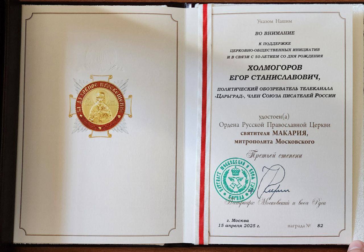 Поздравляю Егора Станиславовича Холмогорова с высокой наградой из рук Святейшего Патриарха Московского и всея Руси Кирилла - орденом Русской Православной Церкви святителя Макария, митрополита Московского. Это важное свидетельство того, что Русская Церковь и русское национальное и имперское движение существуют не в параллельных, но в единой реальности. Сам Егор давно заслужил и церковные, и государственные награды за потрясающие православно-имперские исследования, глубокие и прекрасно снятые фильмы, за свою позицию по отстаиванию интересов России и Православия. Желаю ему никогда не унывать, с Божией помощью идти вперед, увидеть русский Киев и русскую Одессу, и крепкого здравия, потому что в России надо жить долго.