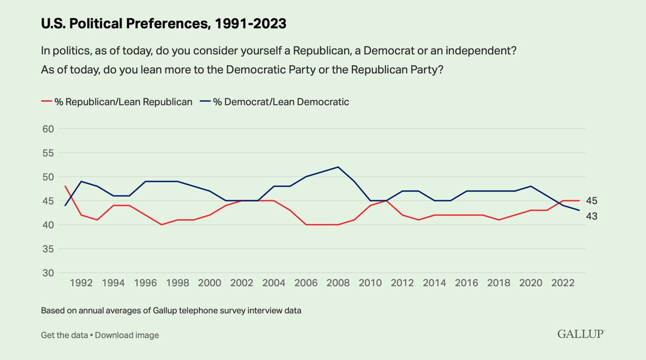 Неудивительно, что на этом фоне число сторонников Демпартии рухнуло до рекордно низкого уровня. В последнем опросе Gallup 45% американцев склоняются к поддержке республиканцев - против 43% за демократов. Для республиканцев это рекордно высокий показатель аж с 1991 года.