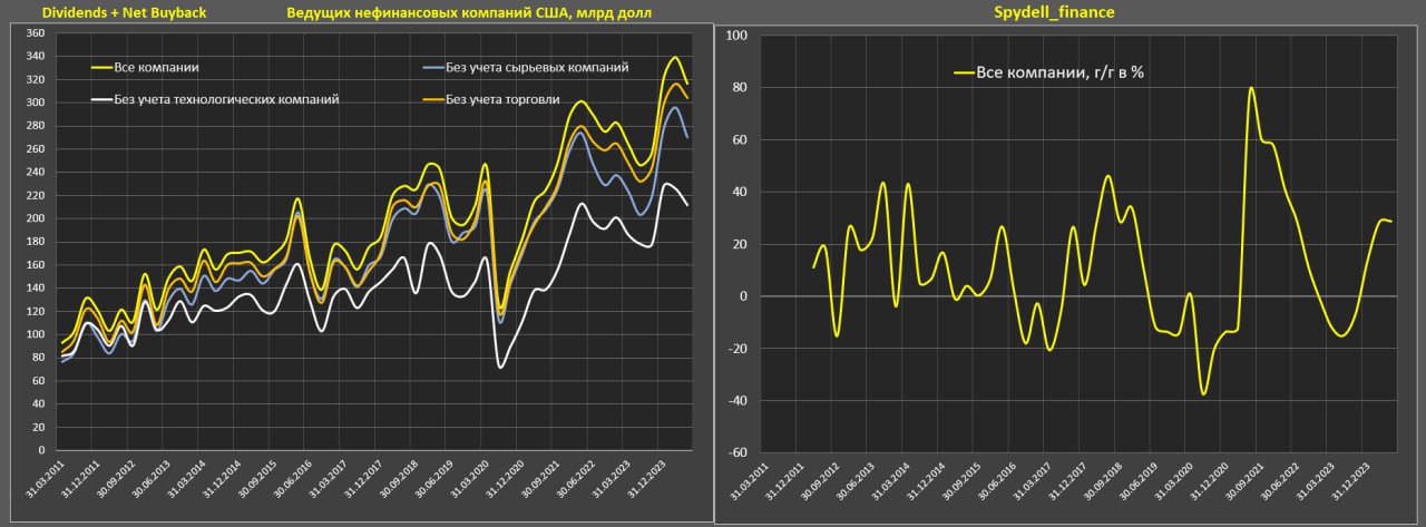 На акционерная политику (дивиденды + чистый байбек) ВСЕ нефинансовые компании США с 2кв23 по 1кв24 направили 1.36 трлн, а среди тех, кто отчитался за 2кв24 и имеет отчетность с 2011, - 1.16 трлн за сопоставимый срок по собственным расчетам.
