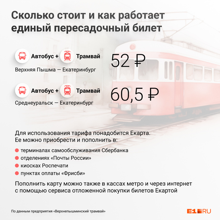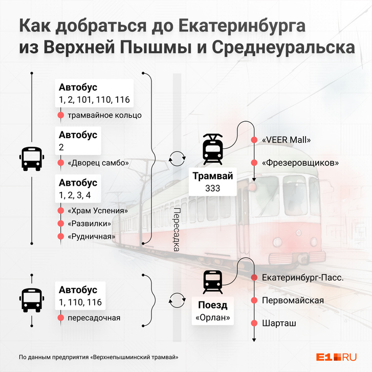 - С 18 ноября в расписание трамваев и автобусов внесли изменения: первый трамвай из Верхней Пышмы будет отправляться уже в 05:55, а последний — в 00:08 (это гораздо позднее, если сравнивать с окончанием автобусного движения).