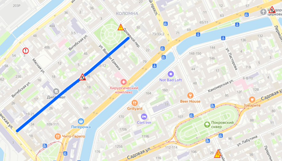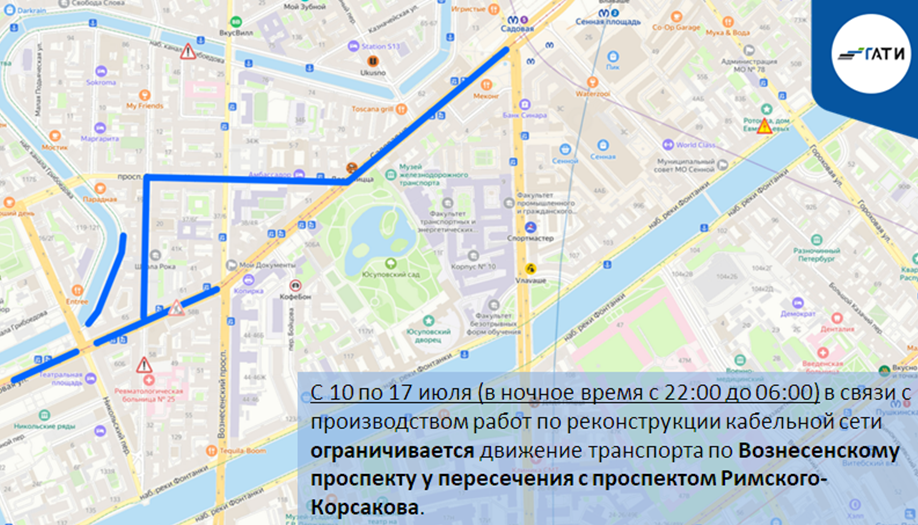 Также в Адмиралтейском районе введут ограничения на Вознесенском проспекте (возле перекрёстка с проспектом Римского-Корсакова), где ночью с 10 по 17 июля (с 22:00 до 6:00 мск) пройдёт реконструкция кабельной сети.