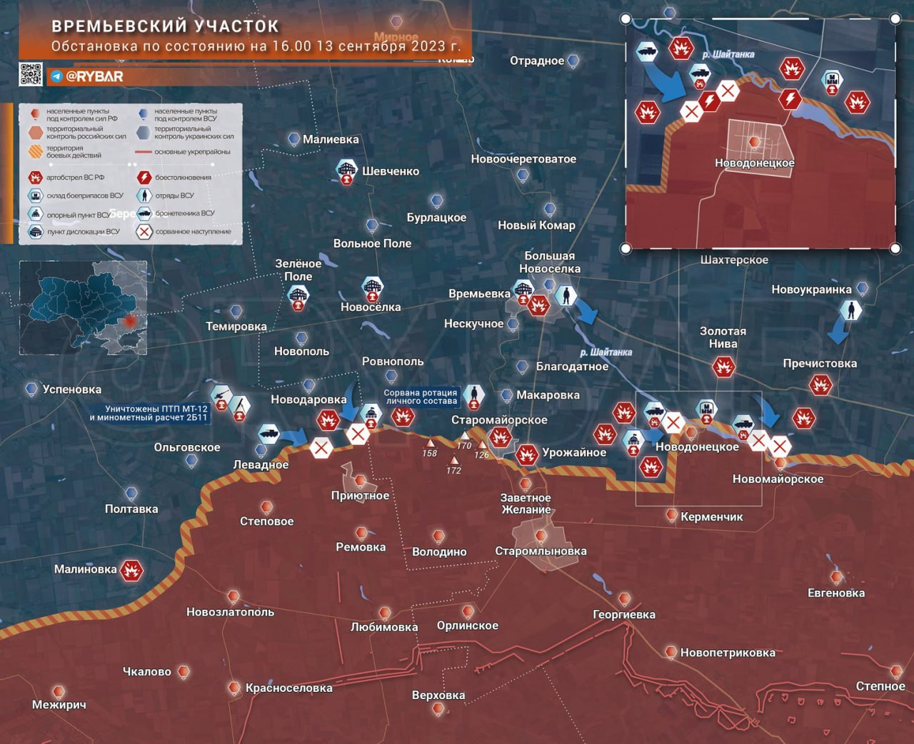 Украинское командование, очевидно, пока не планирует отказываться от дальнейшего наступления на Времьевском участке. Однако после смены направления удара со Старомлыновки на Новомайорское и отсутствия успеха в проведении «мясных штурмов», частичную боеспособность утратил 18 батальон 35 бригады морской пехоты ВСУ. В район Пречистовки регулярно перебрасывают дополнительные силы для пополнения украинских подразделений, которые также становятся лакомой целью для российской артиллерии.