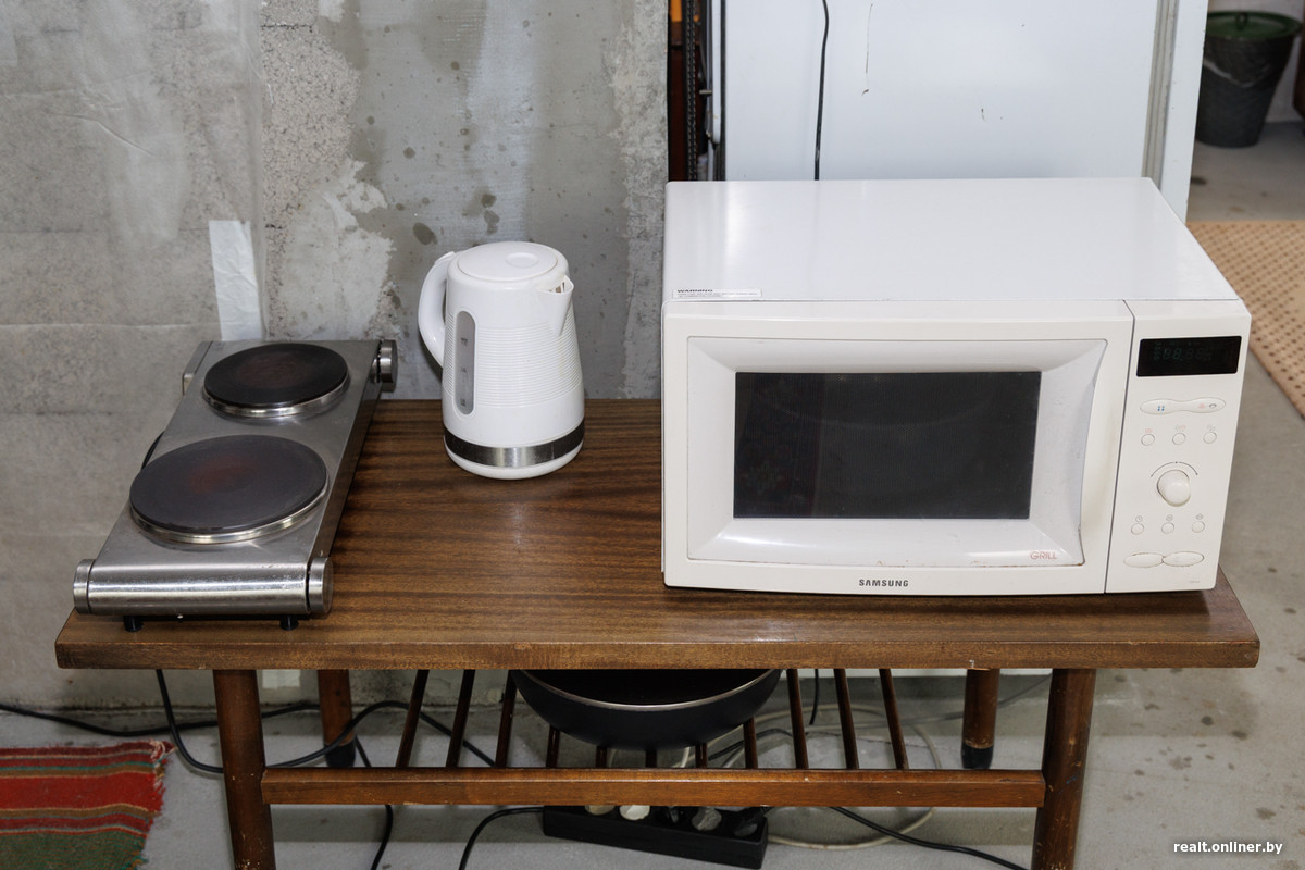 На кухне у молодой пары есть все необходимое — шкафчики, раковина, рабочая поверхность, холодильник, микроволновка, электрочайник и даже электрическая настольная плита на две конфорки.