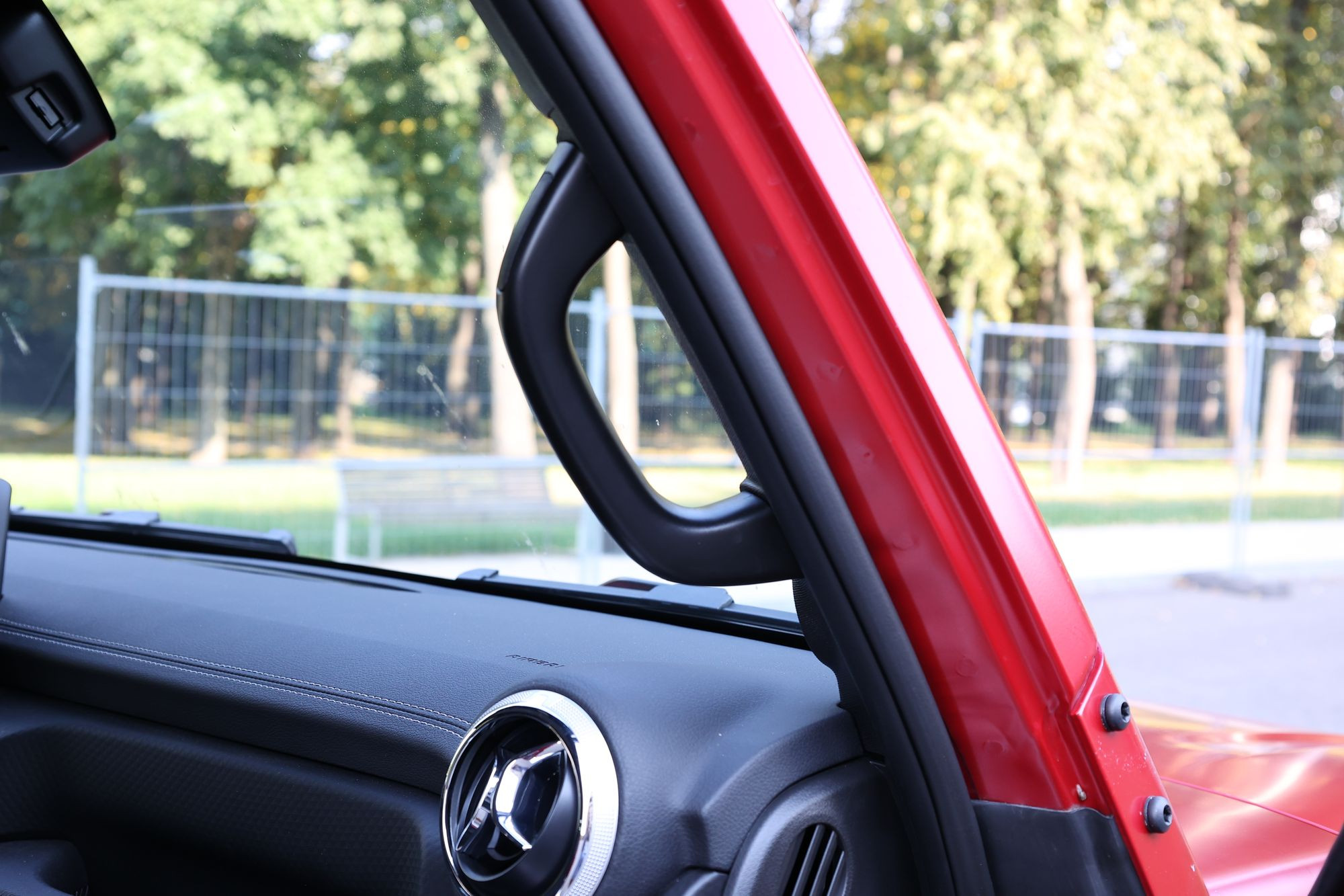 Кузов кабриолет накладывает особые конструктивные требования, поэтому в салоне напоказ выставлен каркас безопасности, обернутый в мягкую ткань. Это очень кстати, потому что в него можно прийти головой при посадке в машину. Чтобы попасть в BJ, шагаешь на подножку, а затем, пригнувшись, ныряешь в салон. Следующая задача – закрыть дверь, а для этого потребуется хлопнуть ей от всей широкой души. За несколько дней теста я произнес пассажирам фразу «дверь не закрылась» 100500 раз и так успел привыкнуть к усилию, что потом еще неделю на автомате шарахал до звона дверьми на других машинах. Ну и, наконец, предстоит усесться. Диапазон продольного перемещения сиденья не рекордный, так что водителям ростом сильно за 180 его может не хватить, а руль регулируется только по высоте.