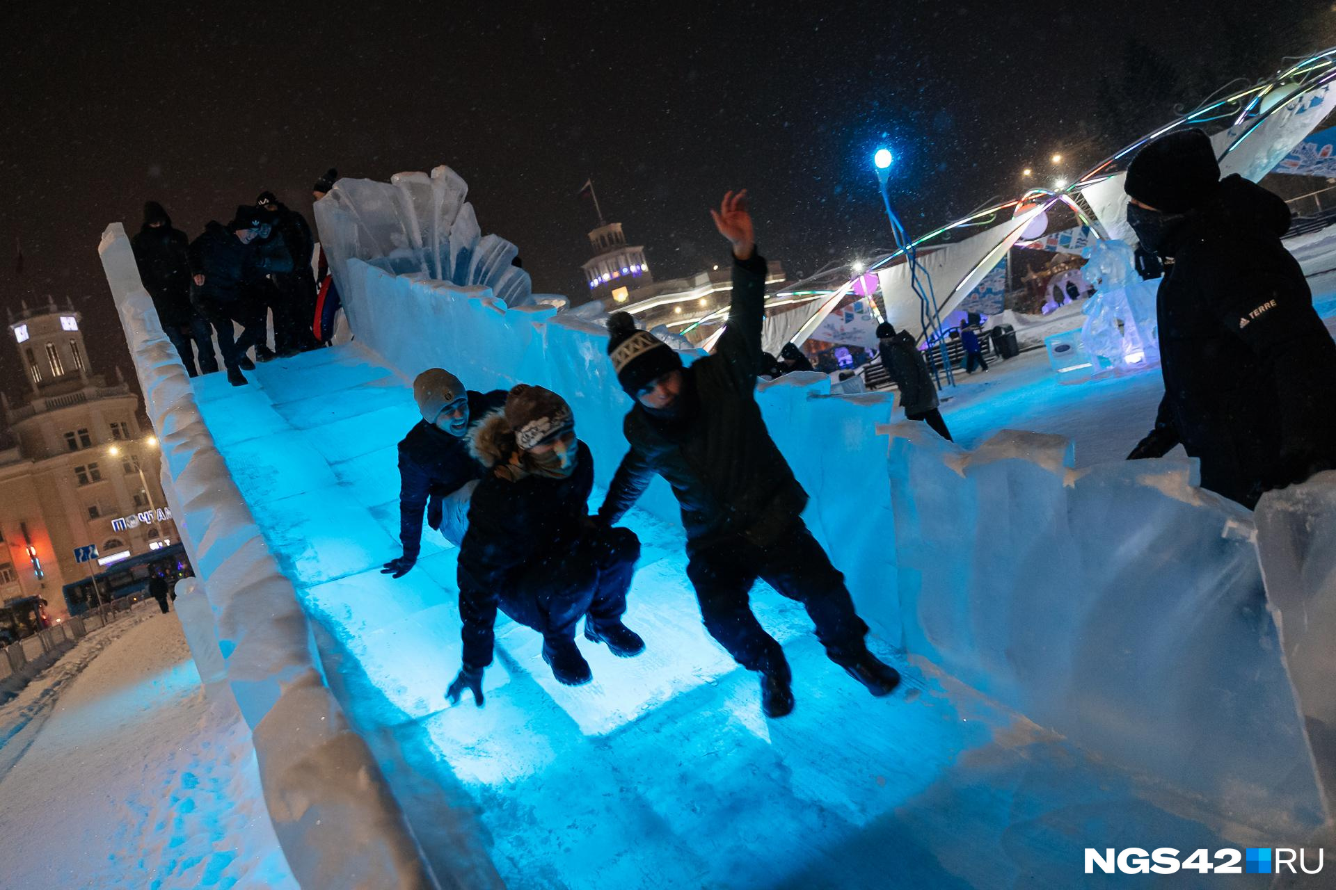 Главная точка притяжения — сквер «Дружба народов» по проспекту Шахтеров, 56/1. Здесь все тоже самое, что и везде: живая ель с подсветкой, ледяные фигуры и горка.