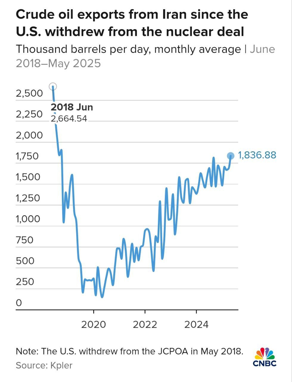 На графике - экспорт сырой нефти из Ирана после выхода США из ядерной сделки в 2018 г. Как видно экспорт нефти из Ирана достиг новых максимумов в 2024 г (но он все еще на 30% ниже мая 2018 г). В течение многих лет Китай покупает оптом иранскую нефть со скидкой (в его отчётности она фигурирует как импорт из Малайзии), и американские санкции в отношении Тегерана мало повлияли на эти потоки. Китай разработал способ импорта иранской нефти в обход западной финансовой системы и доставки. Тегеран экспортирует нефть в Китай танкерами тёмного флота и получает платежи в юанях через небольшие китайские банки, избегая SWIFT и долларовой финансовой системы.