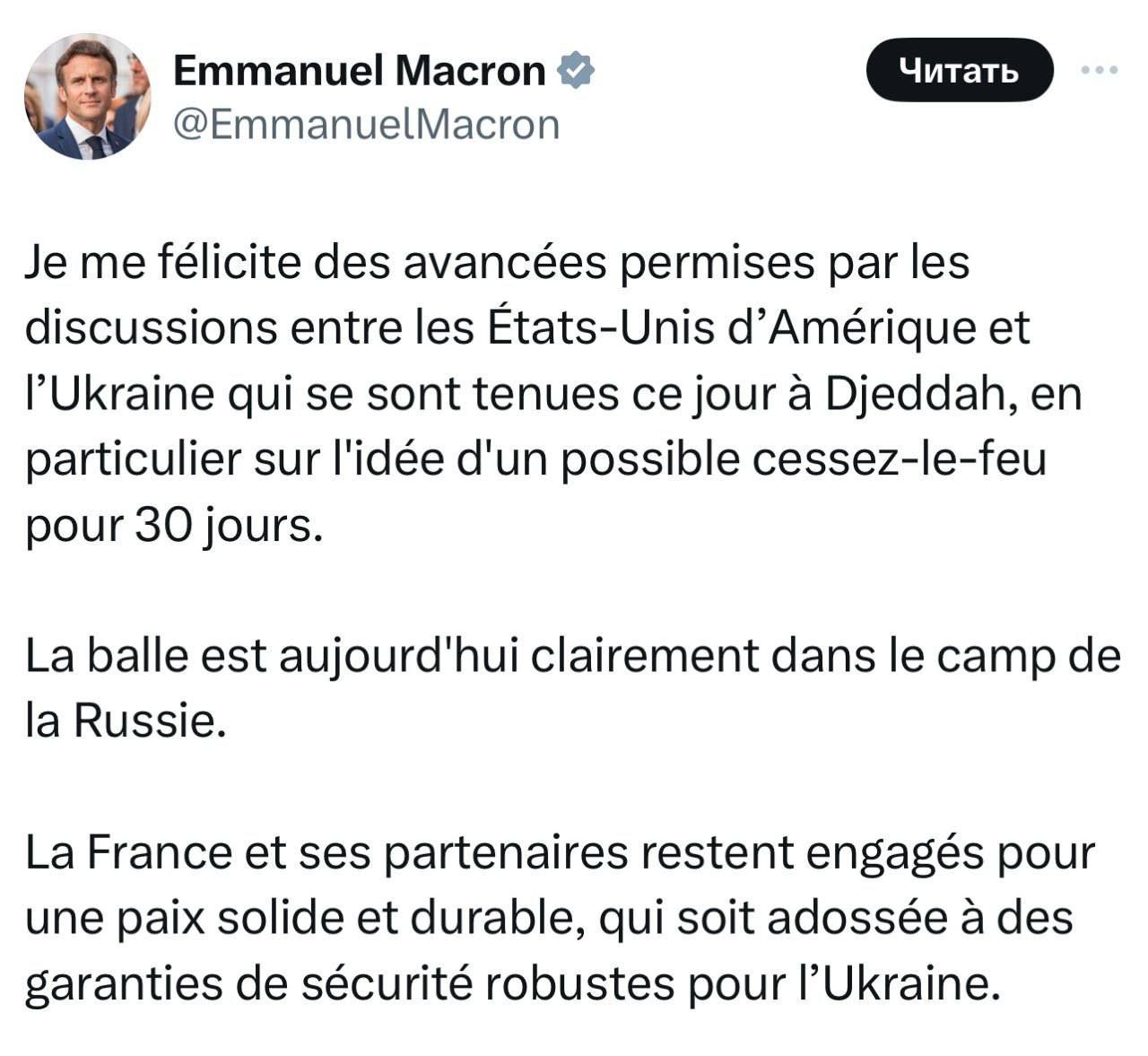 Макрон поддержал идею о 30-дневном перемирии на Украине