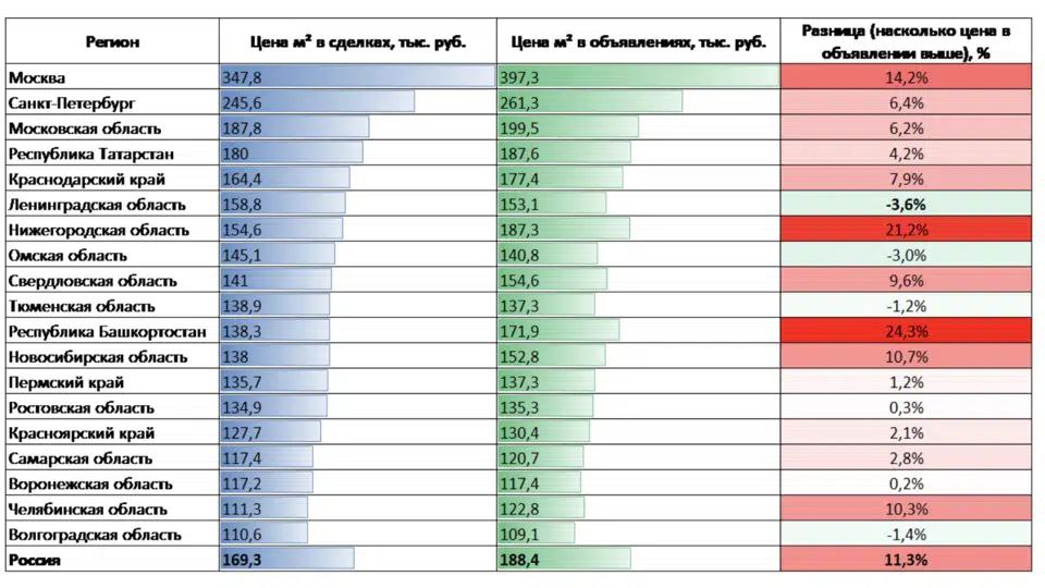 Реальные сделки по жилой недвижимости проводятся значительно дешевле цен в объявлениях. По данным СберИндекса, в октябре средняя стоимость кв. м на первичном рынке России составила 169,3 тыс. рублей. С большим отрывом лидируют Москва и Санкт-Петербург (347,8 тыс. и 245,6 тыс. соответственно). Уровень цен выше общероссийского также отмечен в Московской области и Республике Татарстан.