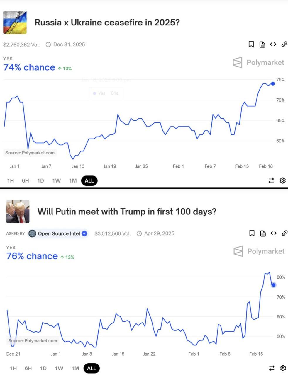 Букмекеры Polymarket оценивают вероятность прекращения огня между Россией и Украиной в 2025 году в 74%. Шансам встречи Путина с Трампом в течение первых 100 дней президентства лидера США дают 76%. Возможные сроки встречи глав РФ и Штатов могут появиться по результатам переговоров в Эр-Рияде, заявил ранее Песков. 🟩 Подписаться | Прислать новость | Читать аналитику