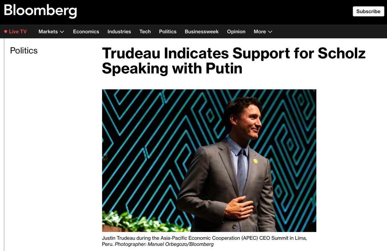 ΠΠ½ Π·Π°ΡΠ²ΠΈΠ», ΡΡΠΎ ΠΠ°Π½Π°Π΄Π° ΠΏΡΠΈΠ²Π΅ΡΠΆΠ΅Π½Π° ΠΏΠΎΠ±Π΅Π΄Π΅ Π£ΠΊΡΠ°ΠΈΠ½Ρ ΠΈ Ρ ΠΎΡΠ΅Ρ ΡΠΊΠΎΡΠ΅ΠΉΡΠ΅Π³ΠΎ ΠΎΠΊΠΎΠ½ΡΠ°Π½ΠΈΡ Π²ΠΎΠΉΠ½Ρ. Π’Π°ΠΊΠΆΠ΅ ΠΊΠ°Π½Π°Π΄ΡΠΊΠΈΠΉ ΠΏΡΠ΅ΠΌΡΠ΅Ρ ΠΏΠΎΠ΄Π΄Π΅ΡΠΆΠ°Π» ΡΠ΅ΡΠ΅Π½ΠΈΠ΅ Π¨ΠΎΠ»ΡΡΠ° ΠΏΠΎΠ·Π²ΠΎΠ½ΠΈΡΡ ΠΡΡΠΈΠ½Ρ, ΠΏΠΈΡΠ΅Ρ Bloomberg.
