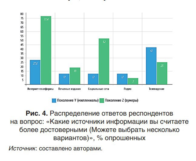 Донской гостех университет в ноябре 2022 – марте 2024 года проводил опрос среди зумеров (16-24 года на момент опроса) и миллениалов (25-40 лет) о доверии медиа («Социология», №11, 2024)