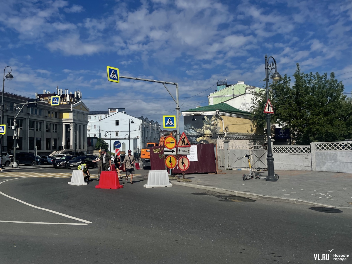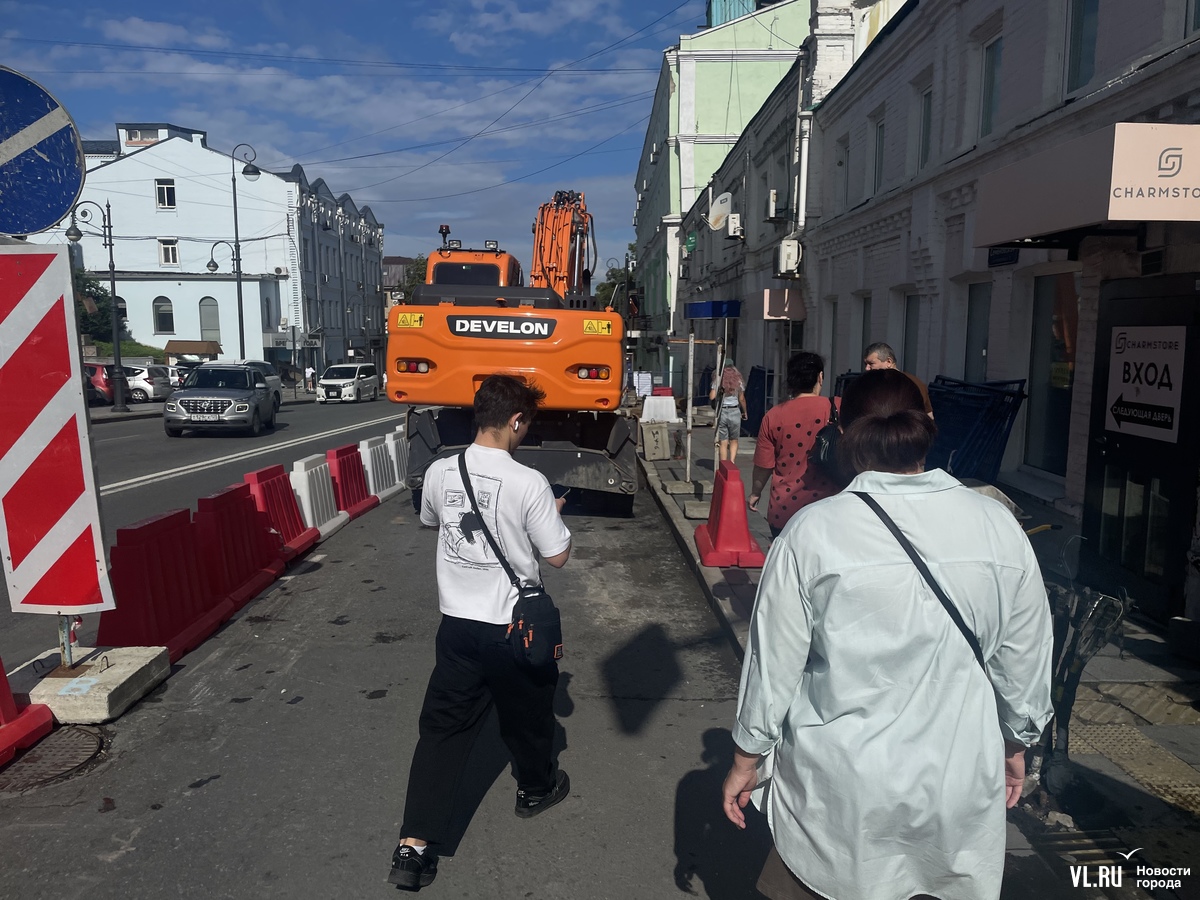 На время раскопок проход по тротуару с северной стороны улицы будет ограничен. Пока не до конца понятно, останется ли свободный доступ ко всем коммерческим помещениям, кафе и магазинам. Но табличку «Проход закрыт» здесь уже повесили. Правда, горожане пока ходят по территории будущих раскопок.