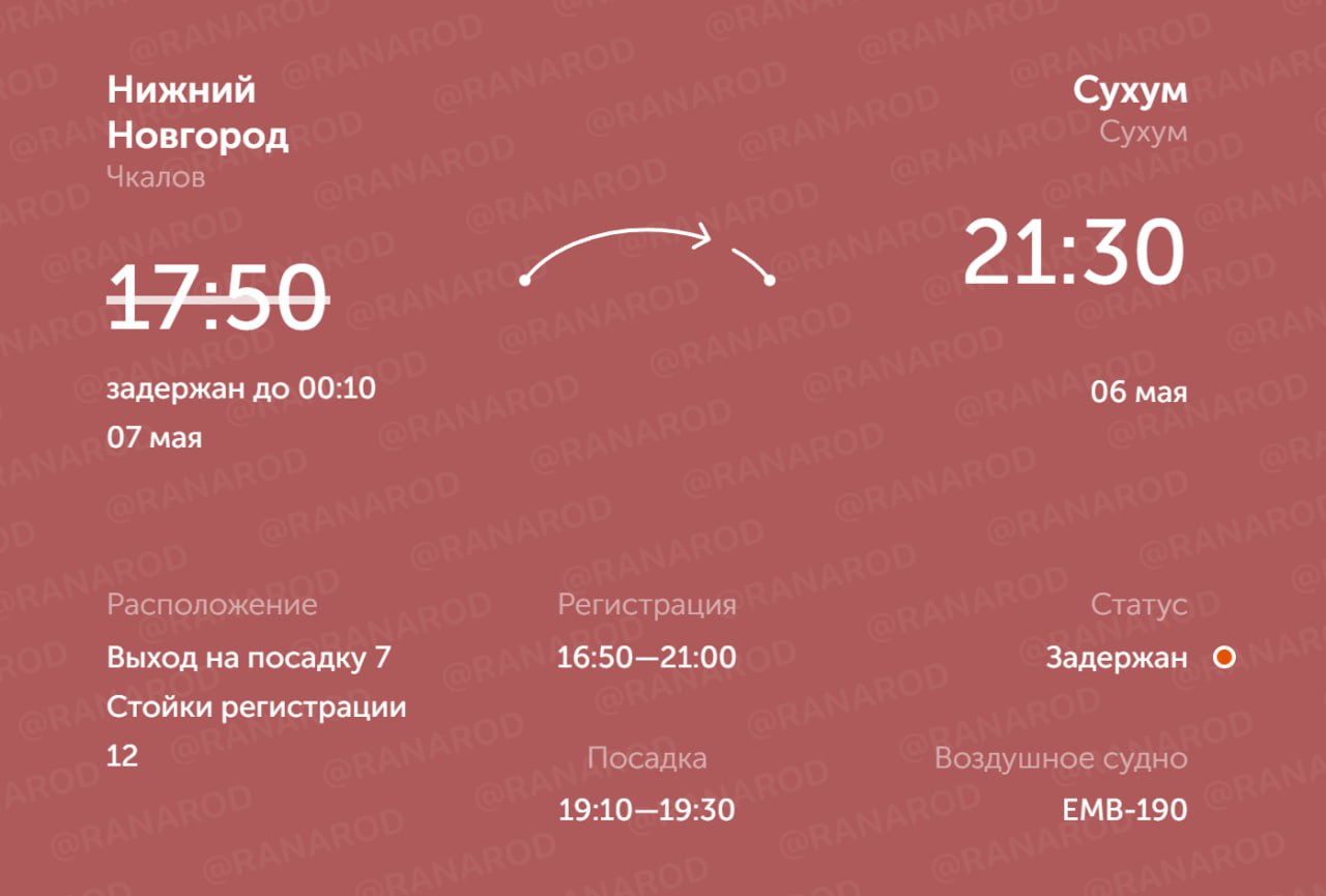 По информации на табло аэропорта Стригино вылет запланирован на 00:10. Обратный рейс из Сухума также сдвигается на 6 часов — с 22:40 на 04:40. Авиакомпания уведомляла пассажиров об изменении времени вылета более пяти раз.