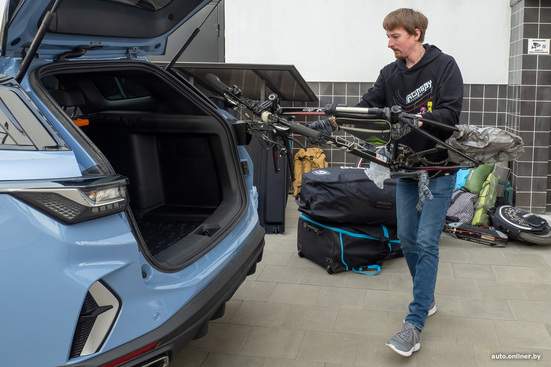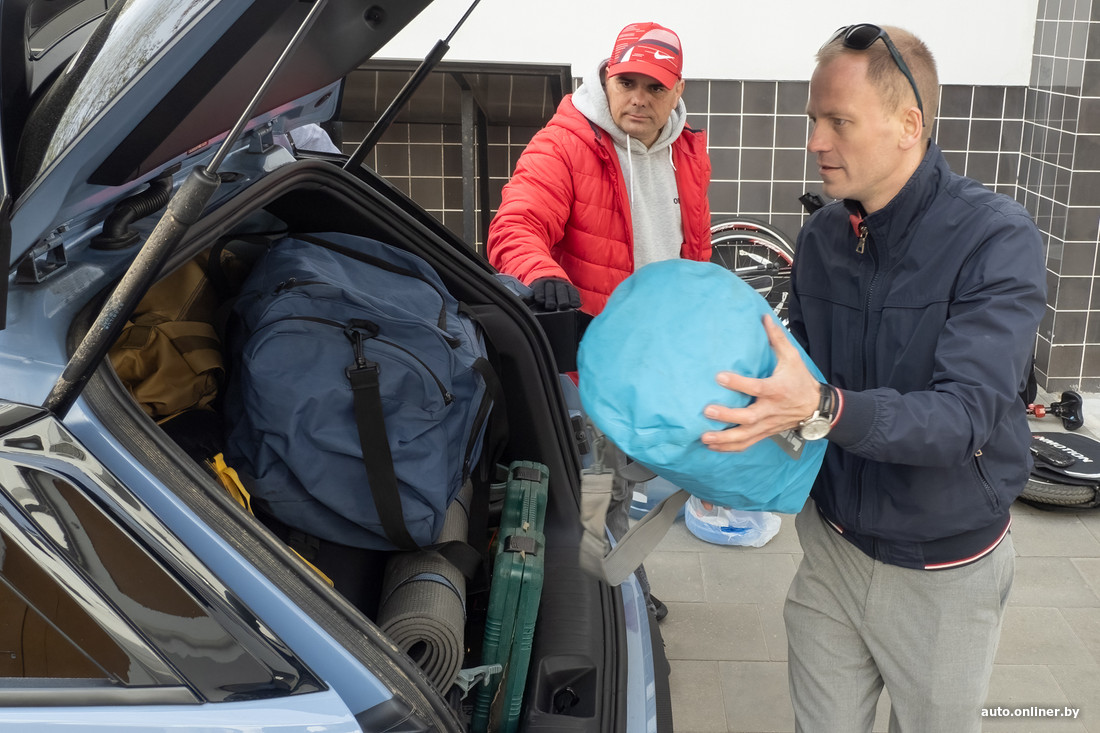 Часть вещей сразу отправляется в салон, половинка спинки дивана для этого складывается, и на нее кладутся большой рюкзак и сумка. Внушительная горка возле автомобиля уменьшается так стремительно, что ребята решают брать и велосипед. Правда, для этого приходится достать из машины часть вещей и переупаковаться.