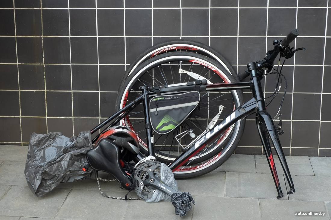 Велосипед решено класть наверх и обкладывать затем мелкими вещами. Колеса снимаются, но все равно остается достаточно габаритная рама, передние звезды с шатунами, нежный задний переключатель и, конечно, далеко не всегда чистая цепь. Ее можно чем-то прикрыть, хотя бы тем же пакетом. А Елена надевает на педали перчатки — и это отличный способ защитить салон от царапин. Вот что значит флорист!