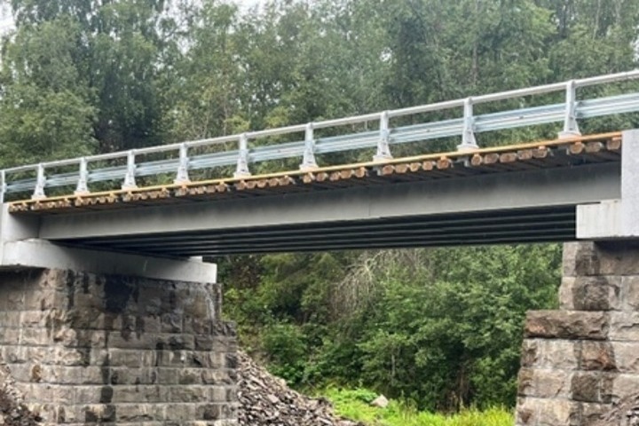 Обновленный мост с барьерами стал шире, а на подъезде к мосту появились основания из щебеночно-песчаной смеси.