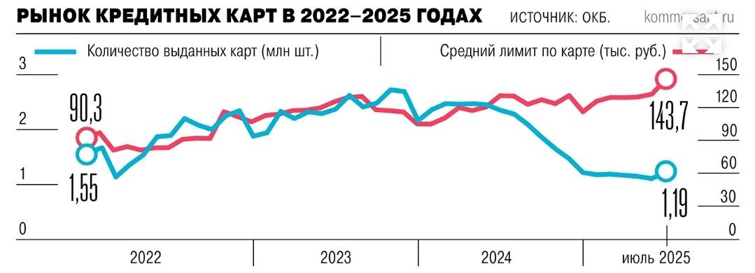 В июле 2025 года сегмент кредитных карт показал первые признаки восстановления. Рост связан со смягчением денежно-кредитной политики ЦБ и повышением риск-аппетита банков. Однако ставки остаются рекордно высокими — в среднем 47% годовых. Пока банки конкурируют за клиентов за счет льготных периодов, кешбэка и бонусов. Ожидается, что устойчивый рост сегмента начнется осенью, однако доля клиентов, выходящих за рамки грейс-периода, может превысить 85%, — Коммерсант.