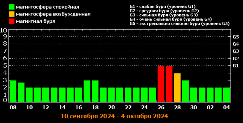28 сентября магнитные атаки ослабнут до 4 баллов, что соответствует небольшой геомагнитной буре.