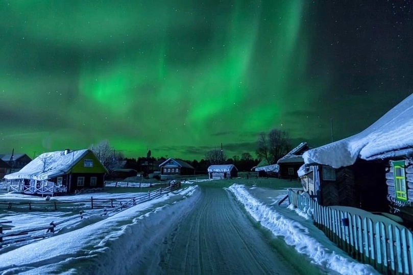 Атмосферное фото северного сияния в старинной деревне в Карелии появилось в сети