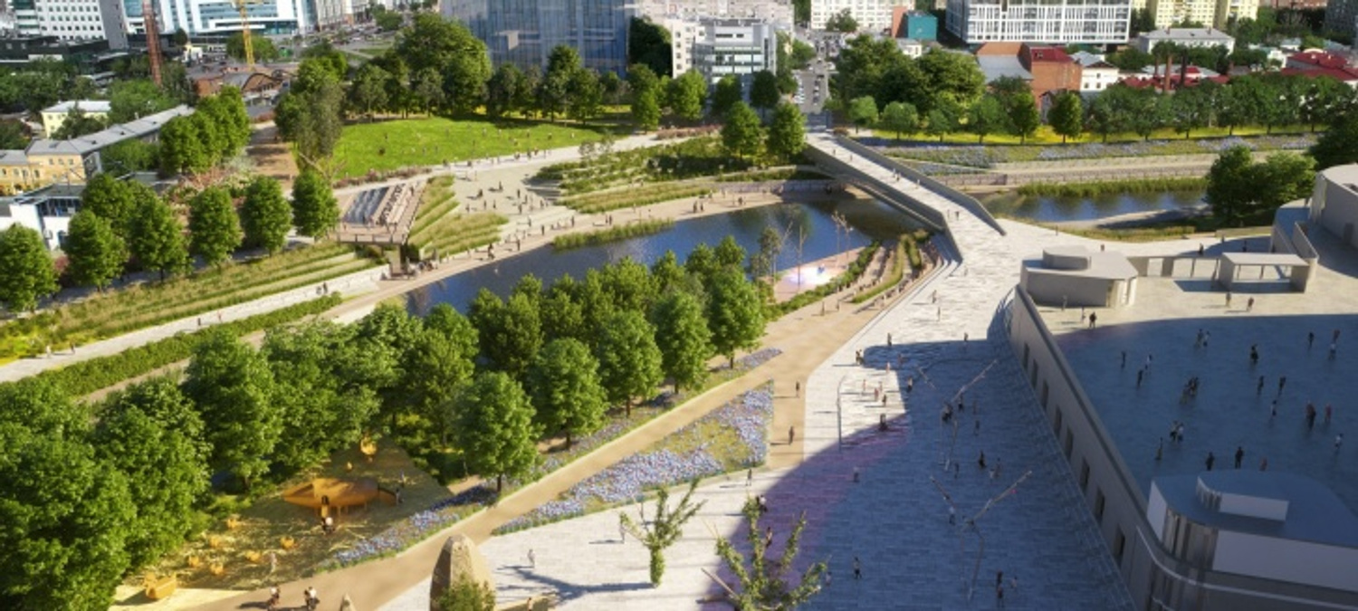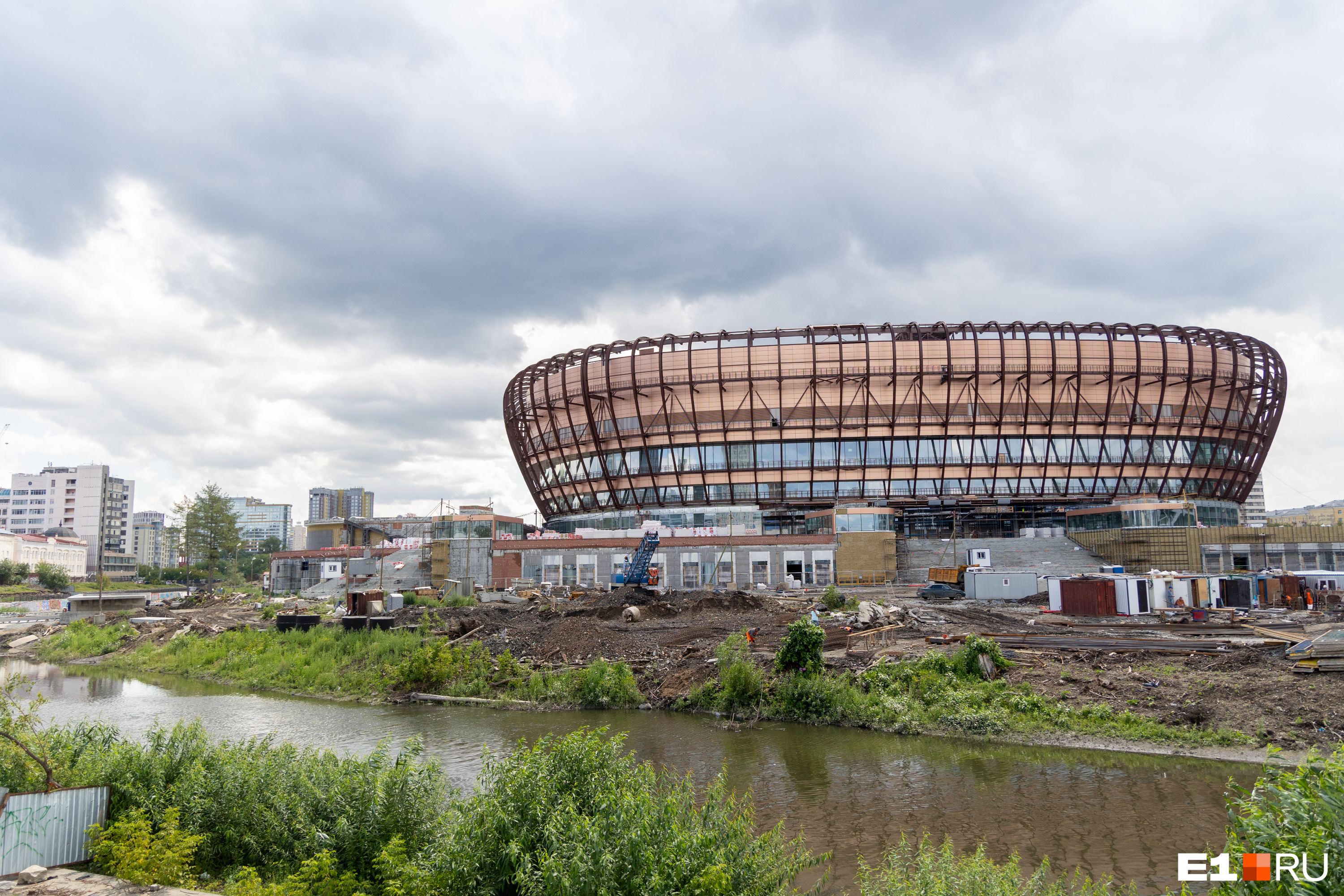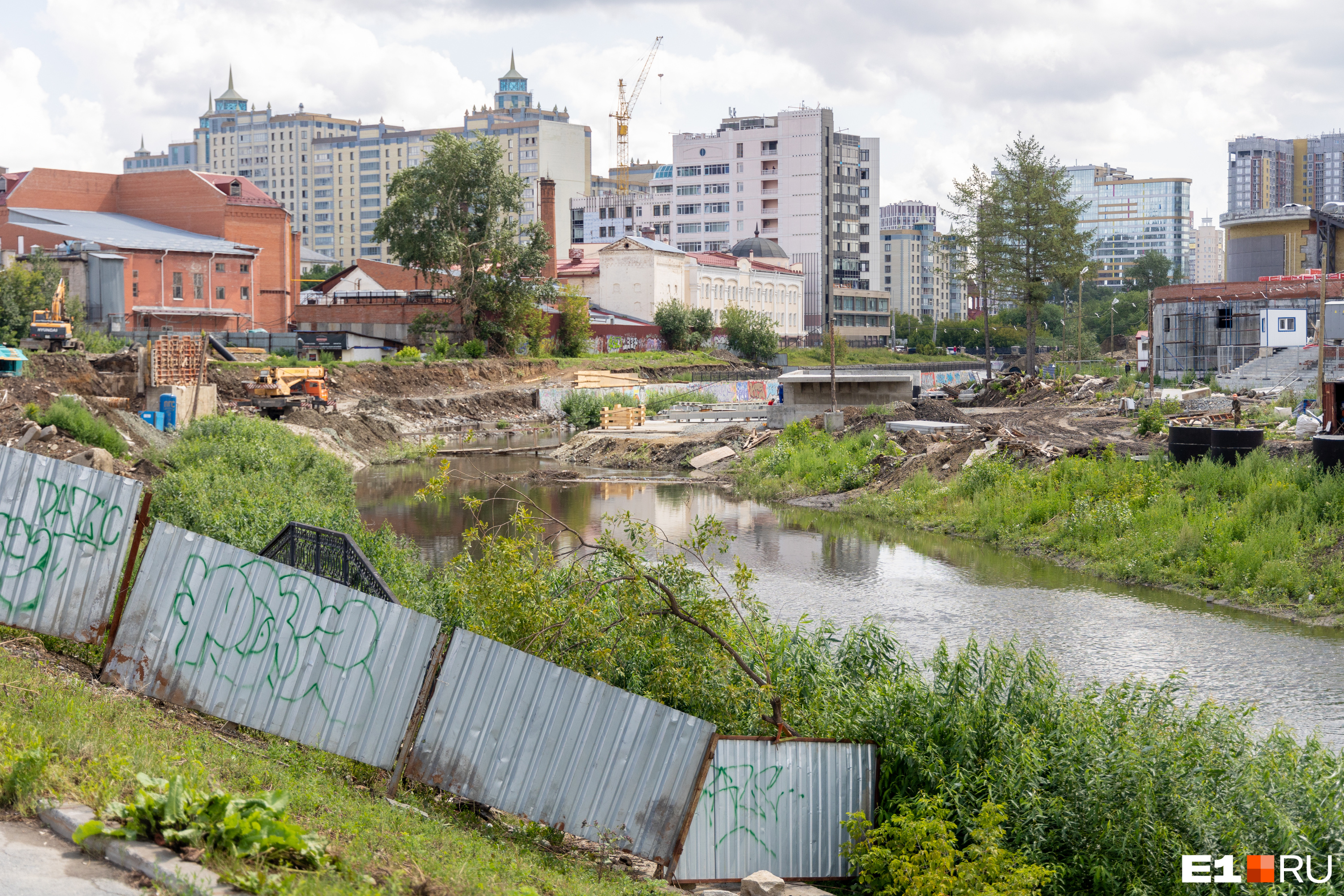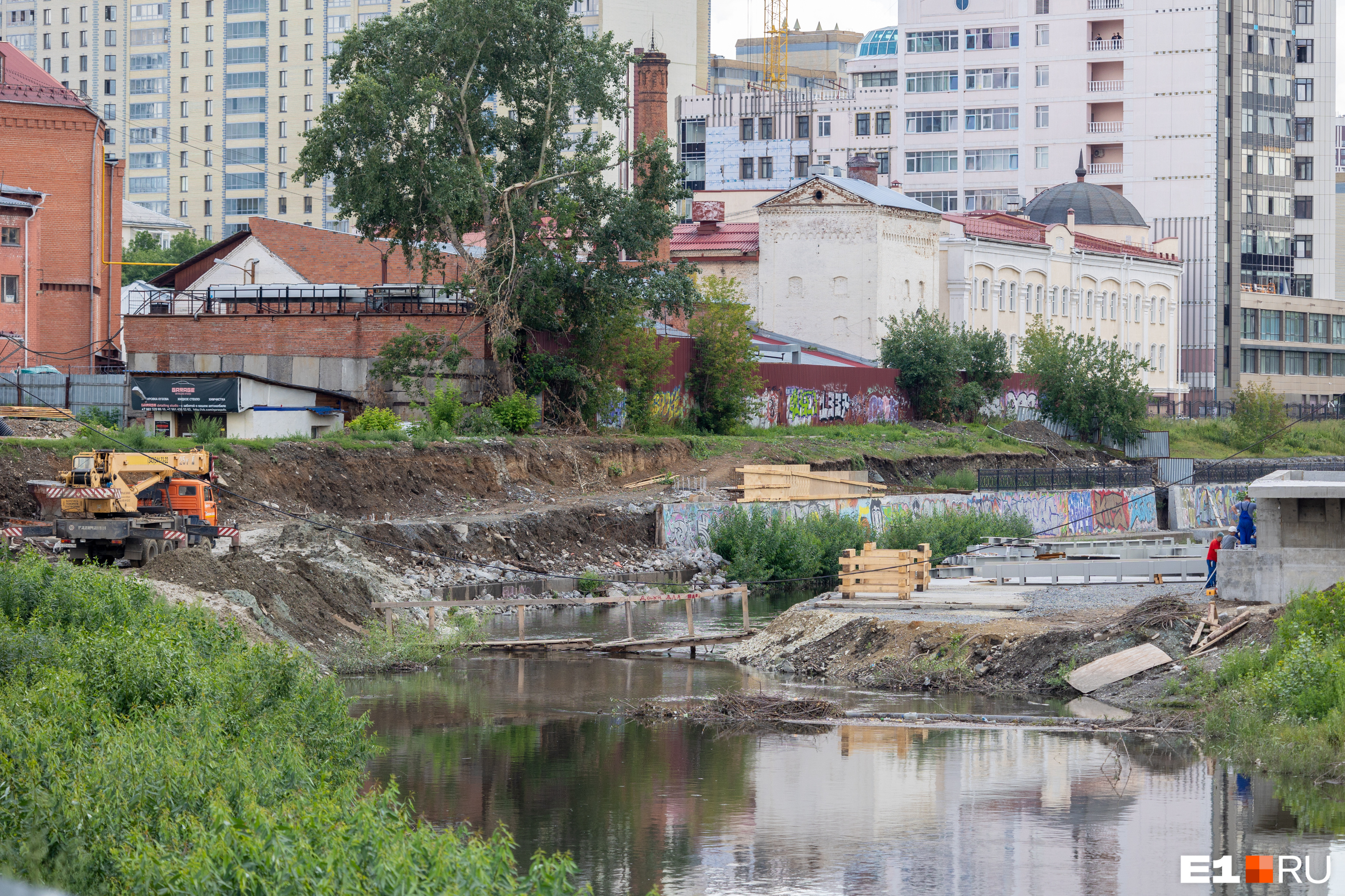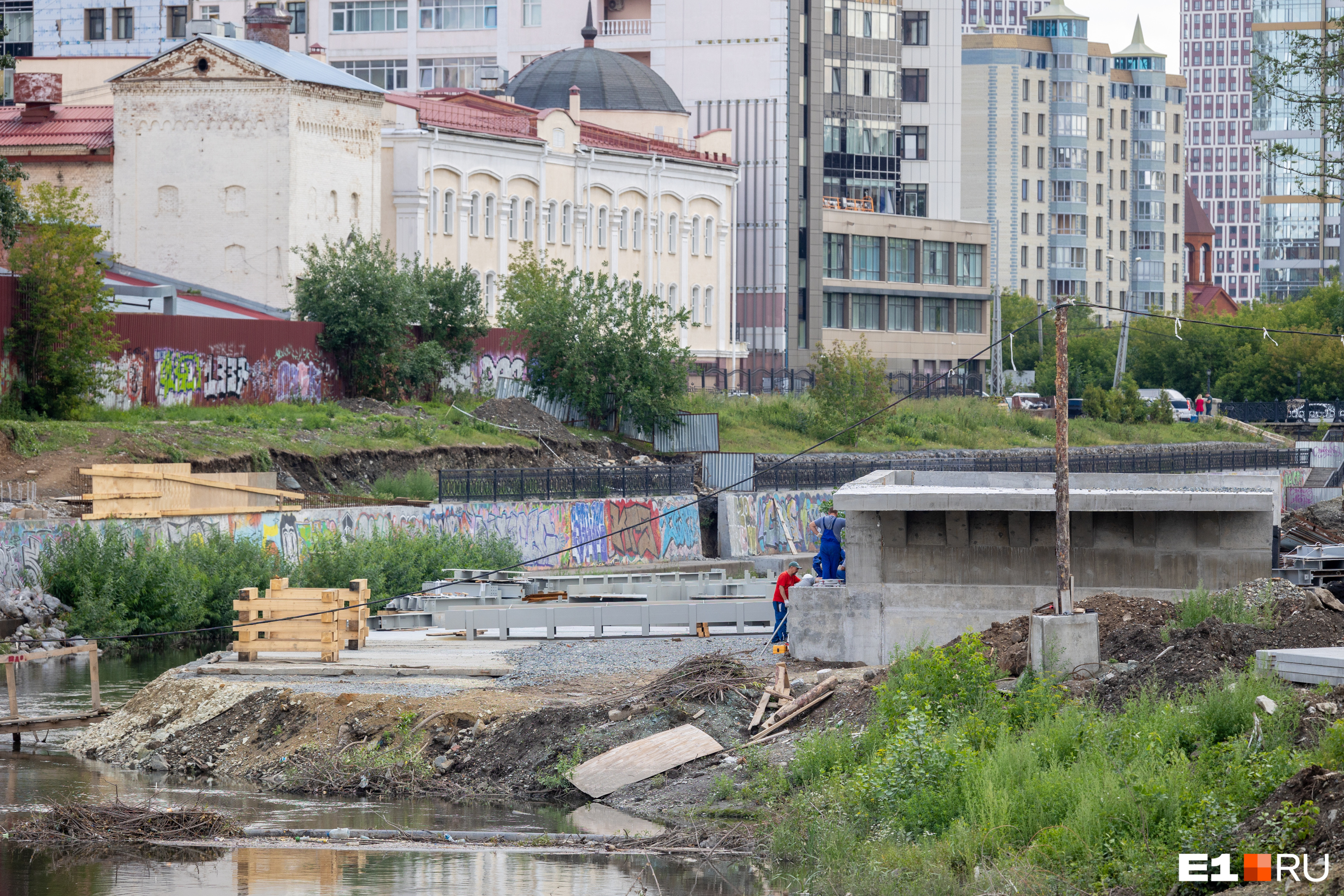 Какие именно работы ведутся внутри — непонятно. Редакция обратилась за комментарием к застройщику, но не получила ответа. Снаружи уже видны очертания стилобата, а с берега перекинули деревянный мостик, который позже заменят на полноценный пешеходный мост через Исеть.